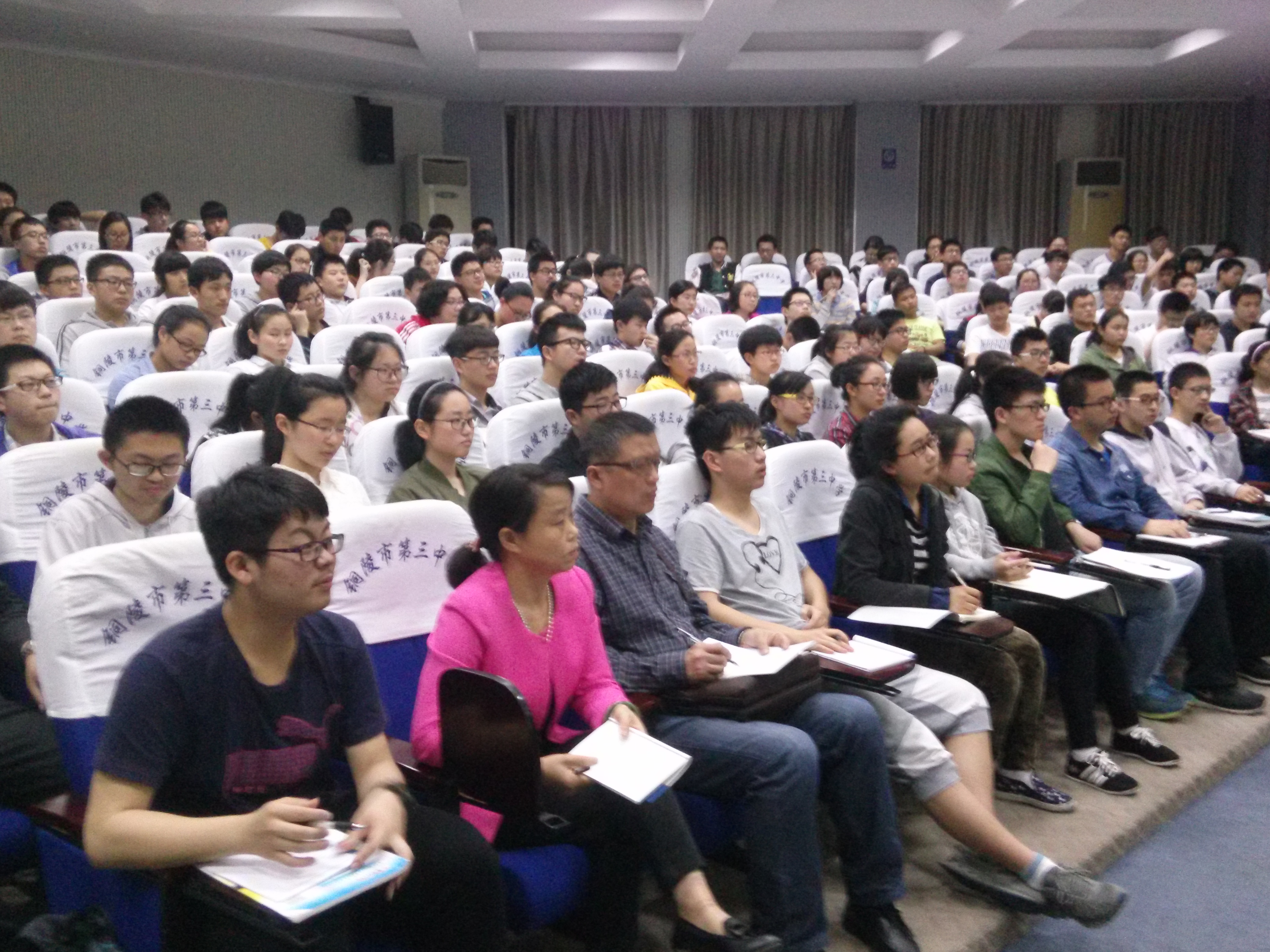 2016年4月21日晚,铜陵市第三中学多功能厅灯火通明,铜陵三中物理教研组全体教师和参加物理竞赛学习的高一高二年级学生汇聚一堂,共同聆听铜陵市教育局教研室副主任,安徽省物理特级教师汪大勇老师为三中学子做的题为《以力学为例谈中学物理的高端学习》的讲座。汪大勇老师以物理科学和物理学科的联系与区别为切入点,从物理学科的基本构造、物理学科研究的基本方法以及物理学科的学习和高端学习这三个方向全面阐述了对高中物理学习的理解与认识,特别是在物理学科研究的基本方法的讲解中介绍了物理概念模型、物理条件模型、物理过程模型和物理规律模型对学生在深入理解物理问题时具有很大启发作用。同时汪大勇老师就物理竞赛中的力学问题例举了几个典型例题,深入浅出的予以分析论证,运用多种方法解决问题,赢得在场的教师和学生的一致好评。汪大勇老师的这次讲座为铜陵三中在物理竞赛辅导和学习方面指引了方向,对提高三中学生参与物理竞赛兴趣起到非常重要的推动作用。