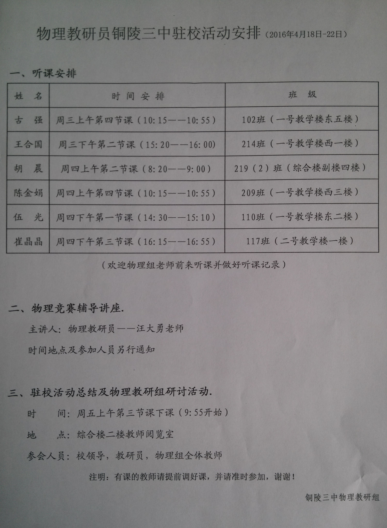 2016年4月18日至22日,铜陵市教育局教研室副主任、物理教研员汪大勇老师来到铜陵市第三中学进行为期一周的驻校活动。在这期间,汪大勇老师深入教学一线,认真听取了我校多位物理教师课堂教学,与授课的教师深入探讨课堂教学的方式方法及策略。