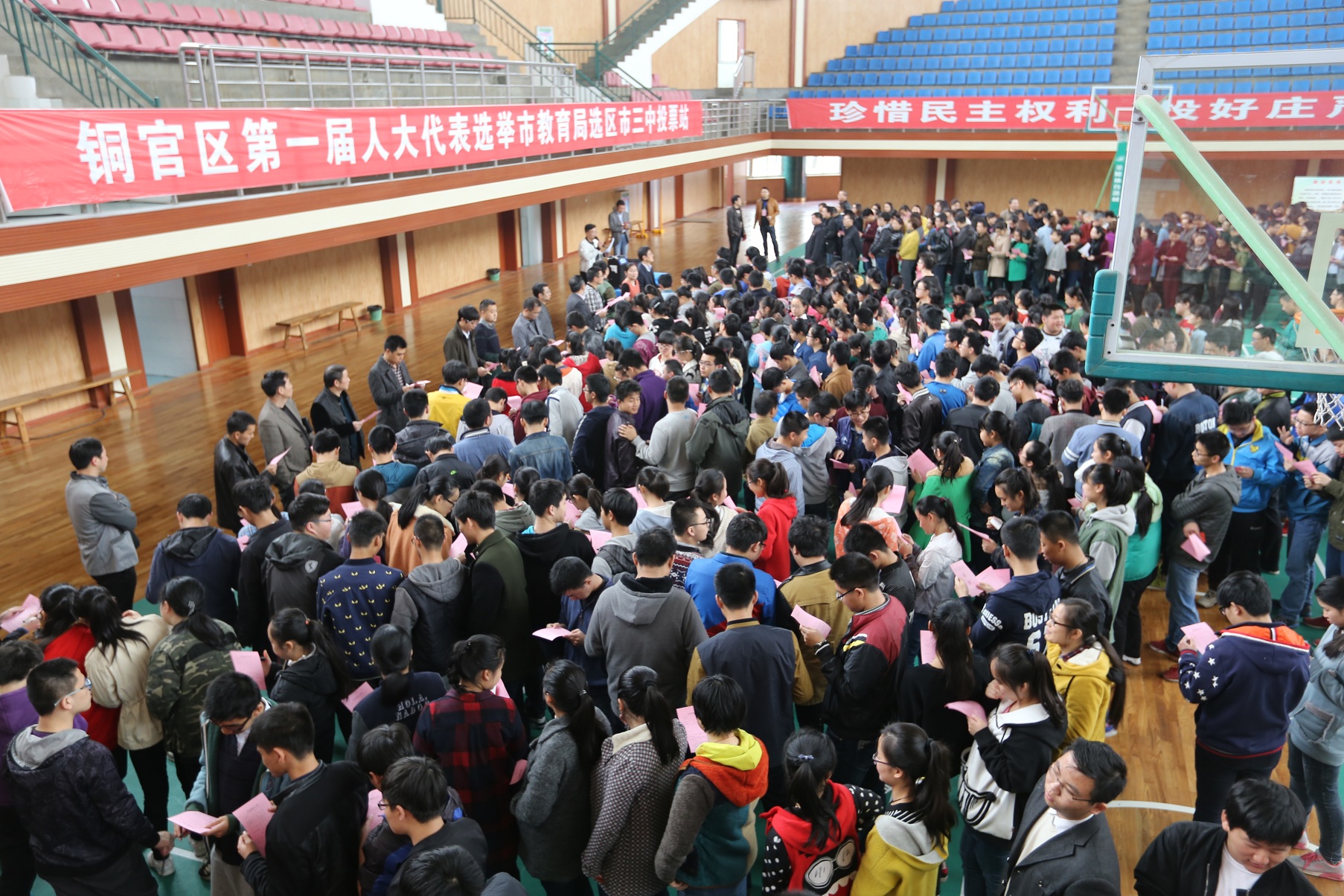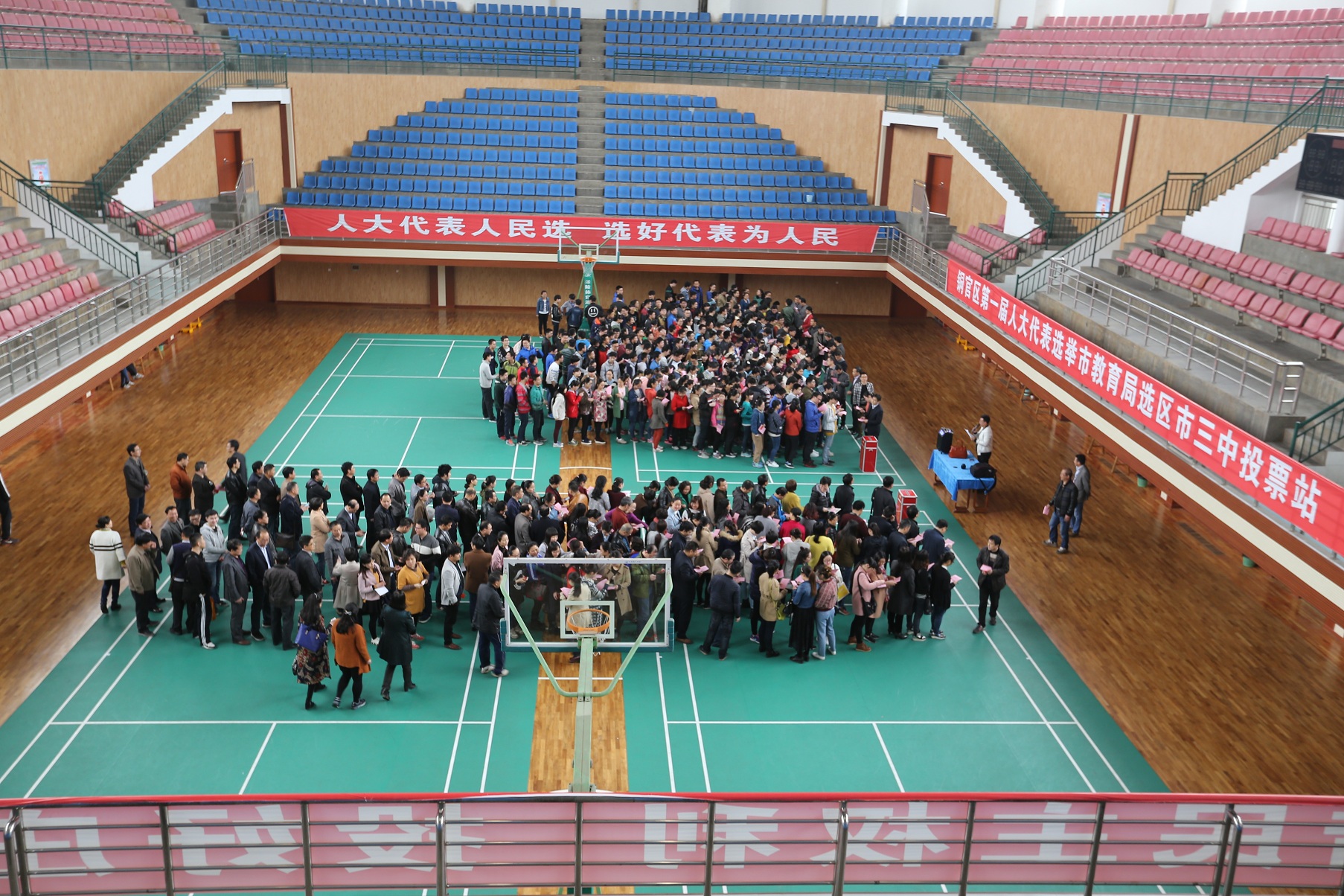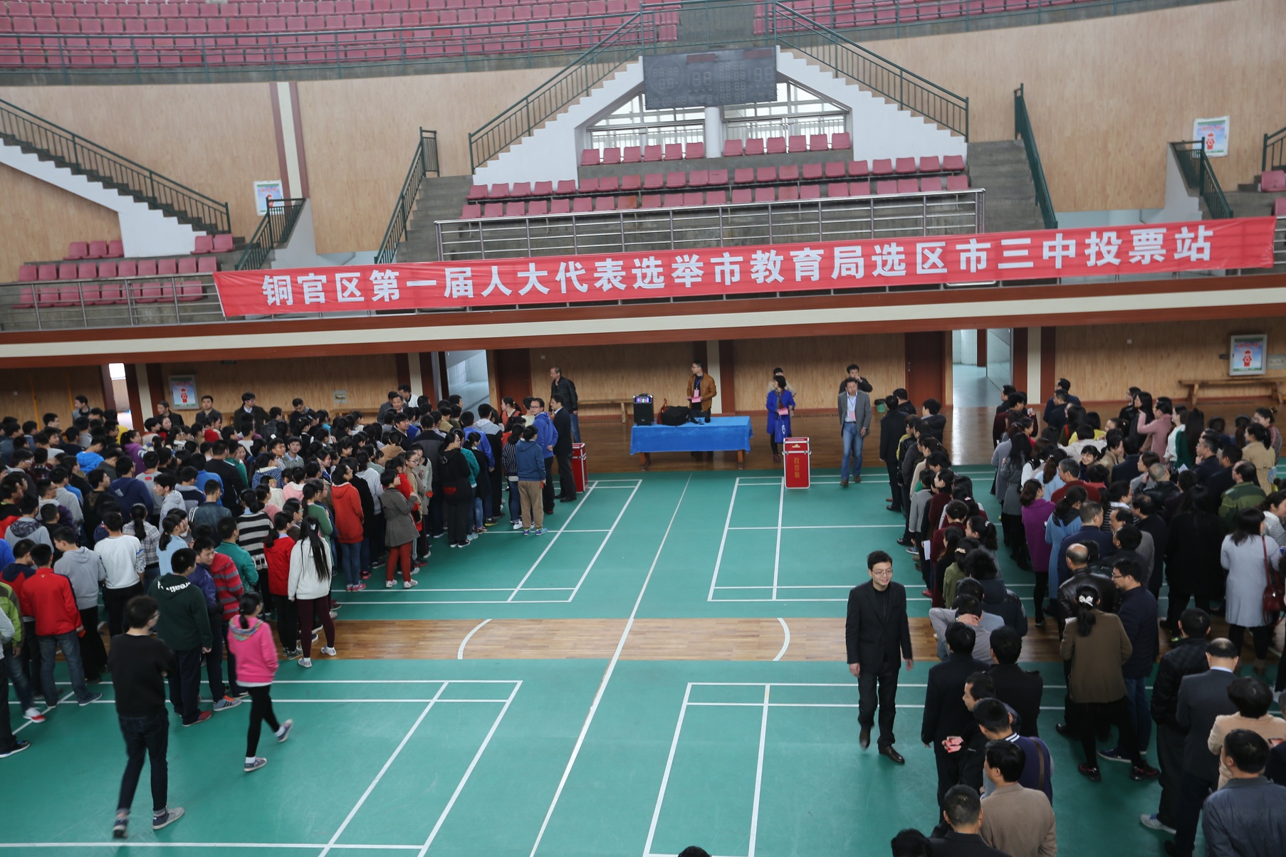 本校讯 今天上午10时,铜官区人大代表选举三中投票站举行选举投票大会,校领导钟士标、吴翀、叶叶与全校500多名师生在校体育馆投下庄严一票。投票大会由校对外联络办公室梁波主任主持。
