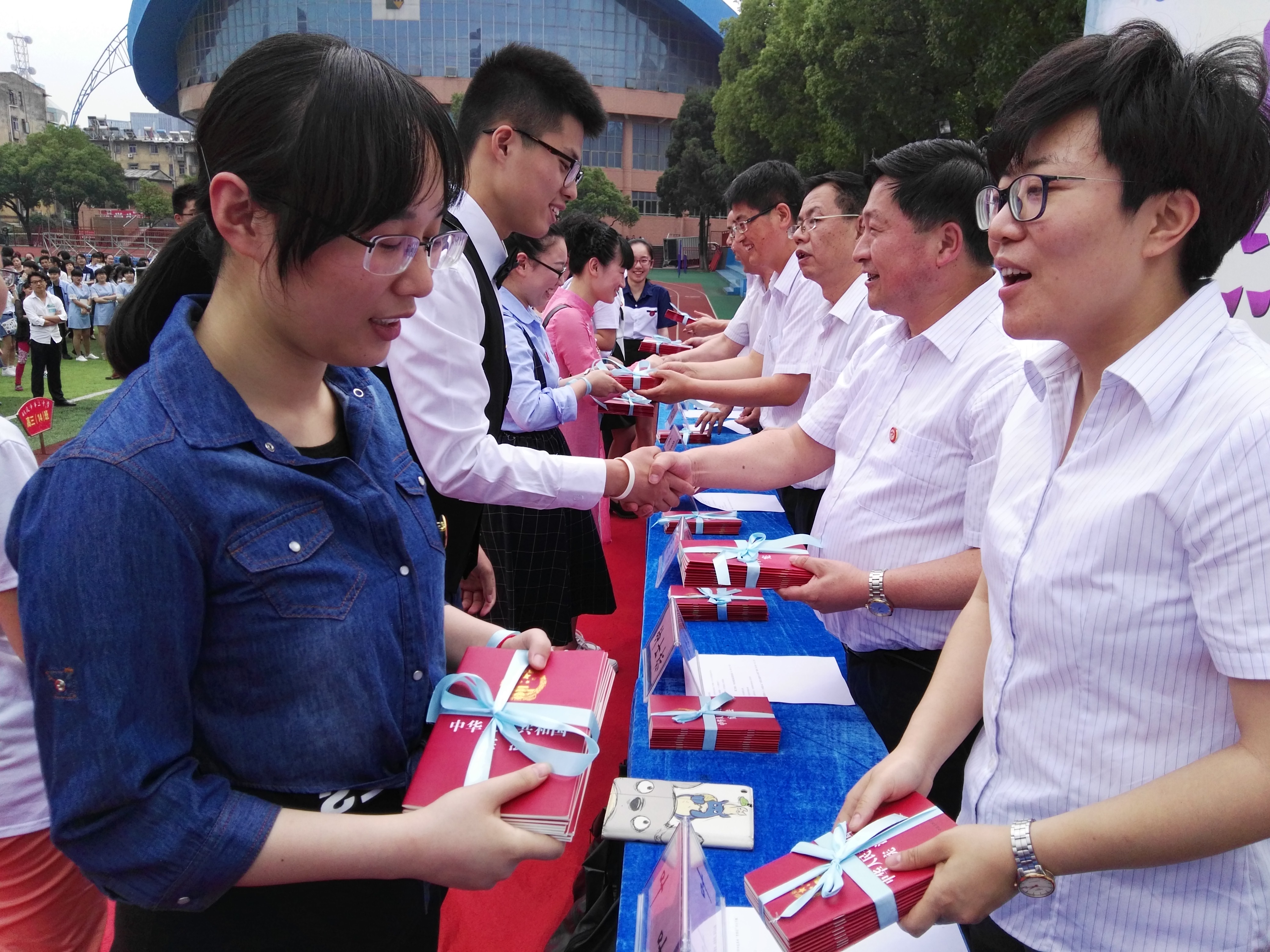 成人礼仪式在雄壮的国歌中拉开序幕,高三学生方堃同学代表全体学生对学校的栽培、父母的呵护表示了衷心的感谢,并表达了开拓进取、坚定理想信念。高三年级教师代表褚军饱含激情的讲话给学生以鼓励和支持。活动现场,校领导钟士标、吴翀、叶叶等向同学们赠送了《宪法》读本。