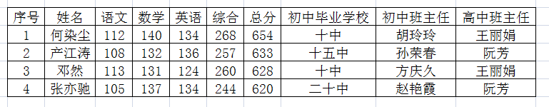 今年我校高二共有20名报名参加高考,成绩公布后,主体突出,亮点多多。其中达一本线的13人,一本达线率65%;其中,620分以上4人,最高分为654分,为何染尘同学。
