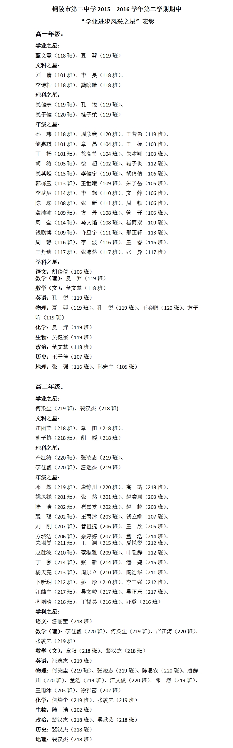 铜陵市第三中学2015—2016学年第二学期期中 “学业进步风采之星”表彰