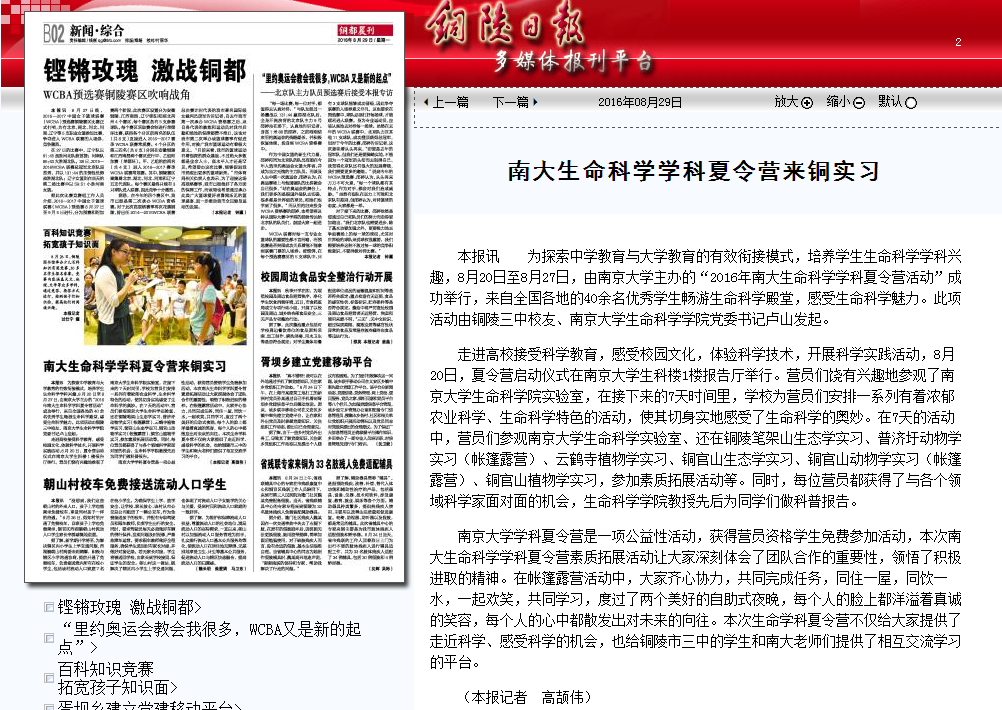 本报讯 为探索中学教育与大学教育的有效衔接模式,培养学生生命科学学科兴趣,8月20日至8月27日,由南京大学主办的“2016年南大生命科学学科夏令营活动”成功举行,来自全国各地的40余名优秀学生畅游生命科学殿堂,感受生命科学魅力。此项活动由铜陵三中校友、南京大学生命科学学院党委书记卢山发起。