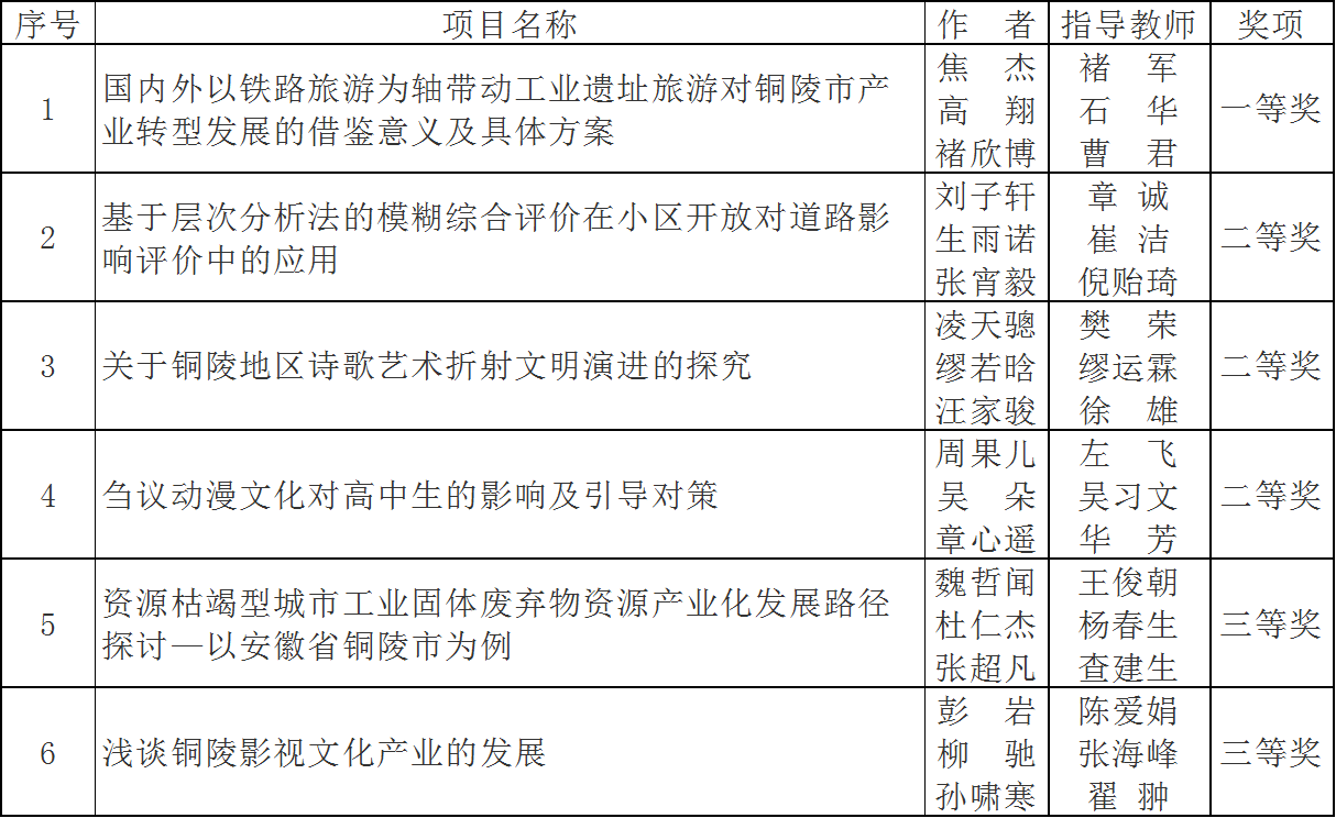 10月10日,由铜陵市科协、教育局联合举办的“第十七届铜陵市青少年科学论坛”在铜陵市科协举行。全市共有12个项目参加角逐,其中奖项设置为一等奖两名,二等奖四名,三等奖六名。我校政教处报送的六个项目中有一个项目获一等奖(即将代表铜陵市参加省赛);三个项目获二等奖;另两个项目获三等奖,充分展示了我校学生可贵的创新意识、实践能力和良好的精神风貌、高效的竞技水平和最强的综合实力。