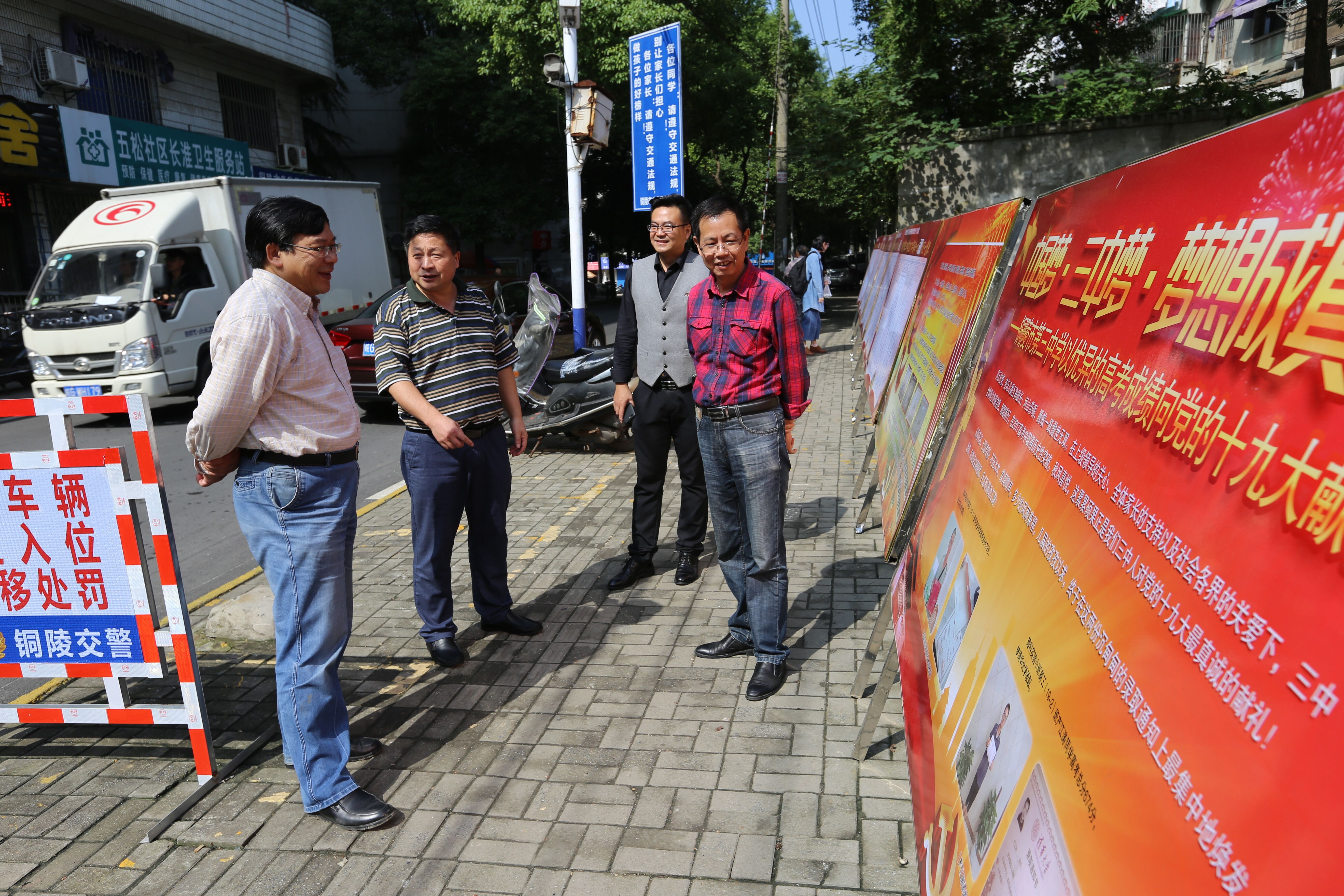 杜志雄 (左一),在钟校长和吴书记及梁科长的陪同下查看三中2017年高考录取情况