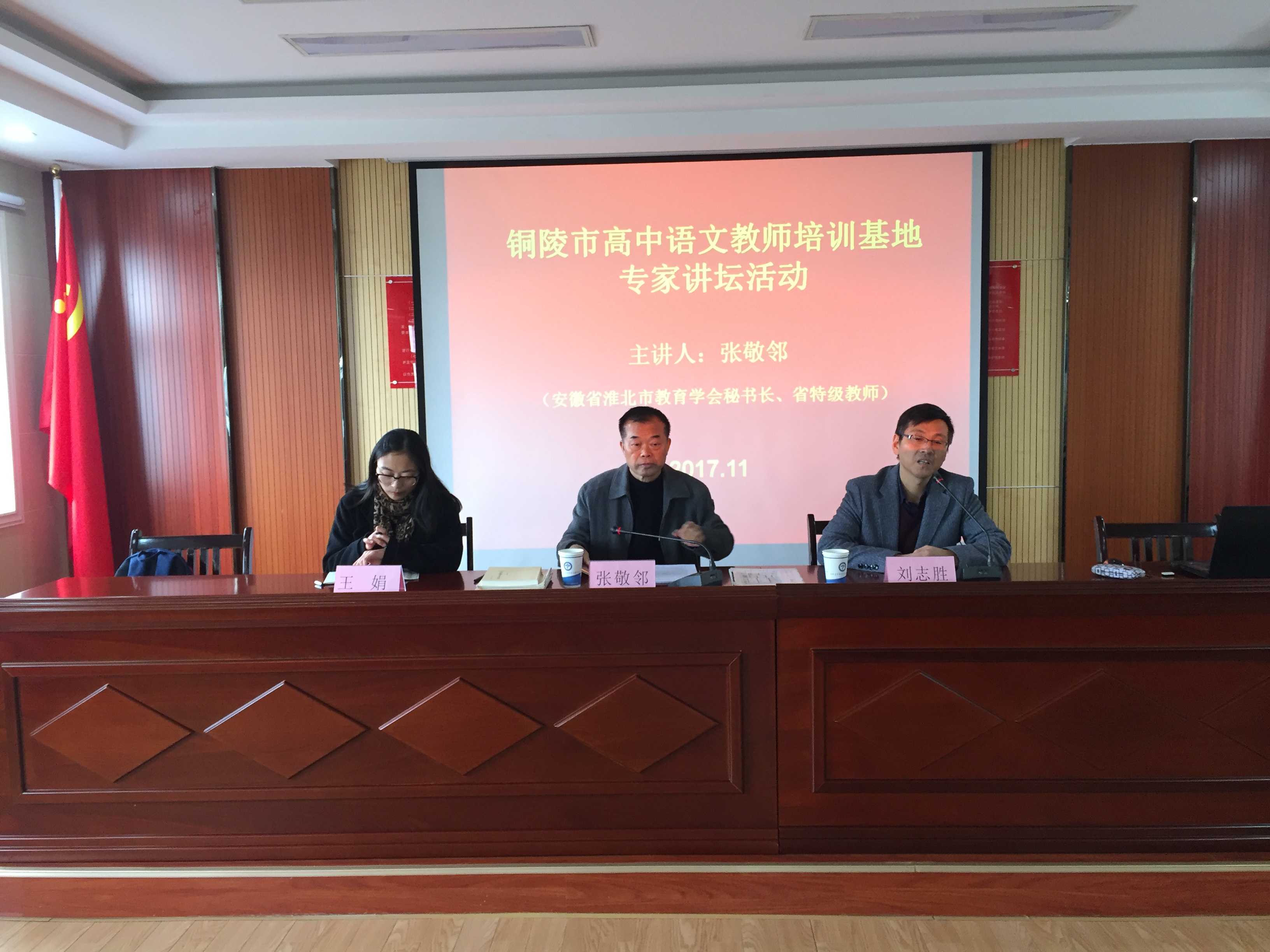 11月21日,由铜陵市高中语文学科基地承办的专家学术讲坛第二期在校多媒体会议室盛大开讲。此次特邀请安徽省淮北市教育学会秘书长、省特级教师、原淮北市语文教研员张敬邻老师作为主讲人,另有幸邀请到淮北市语文教研员王娟老师和铜陵市语文教研员刘志胜老师出席本次讲座。本次讲座由刘志胜老师主持。