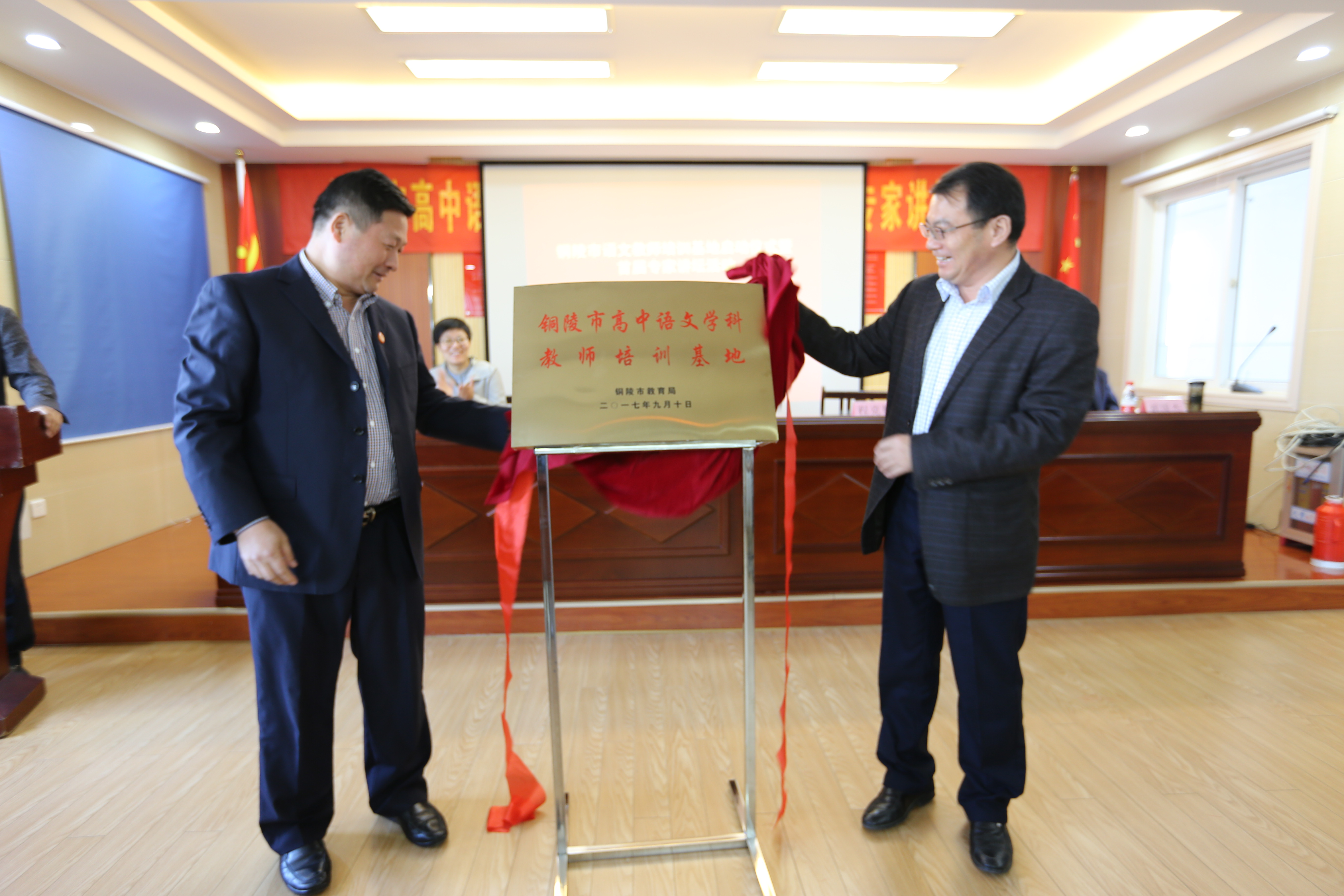 大会第三项,由程克勤副局长和钟士标校长为“铜陵市中学语文学科基地”揭牌。