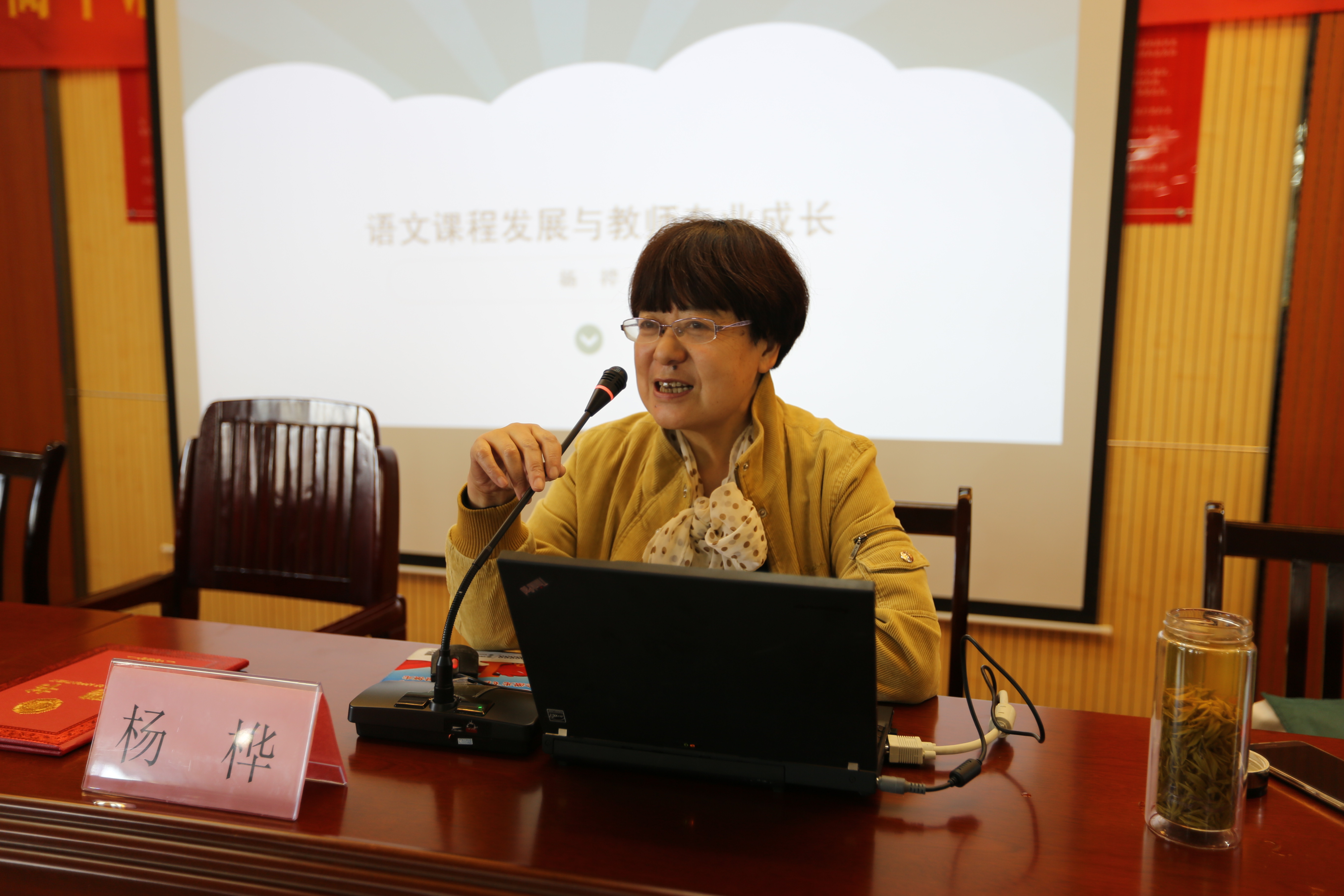 在启动仪式结束之后,由杨桦先生为铜陵市中学语文学科基地作第一次讲课——《语文课程发展与教师专业成长》。杨桦先生的讲座紧扣“课程发展”和“教师发展”两个关键词,回顾了我国课程发展的历史,提出教师专业成长的思路,谈古论今、语涉中外,语重心长的话语给所有的老师留下了深刻的印象。“语文就是语言文字,然后才是其他”的观点得到了在场老师的广泛认同。杨桦先生将近两个小时的讲座娓娓道来、意味深长,不论是“语文老师一定要有很高的文本解读能力”,还是“要做一个有语文味的课堂”等论述,都将让所有与会的老师更能明白语文教师应有的方向和使命,更能明白语文教师成长的要义。