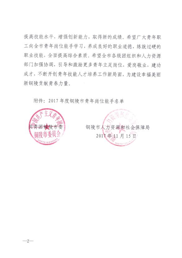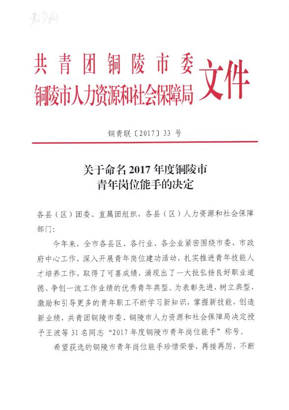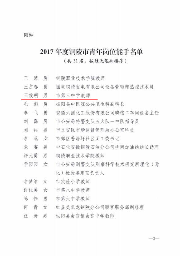 为表彰先进,树立典型,激励和引导全市更多青年职工不断学习新知识,掌握新技能,创造新业绩,近期,共青团铜陵市委、铜陵市人力资源和社会保障局联合开展2017年度铜陵市青年岗位能手评选活动。经推荐、遴选等环节,我校地理教师王俊朝被授予“2017年度铜陵市青年岗位能手”称号。