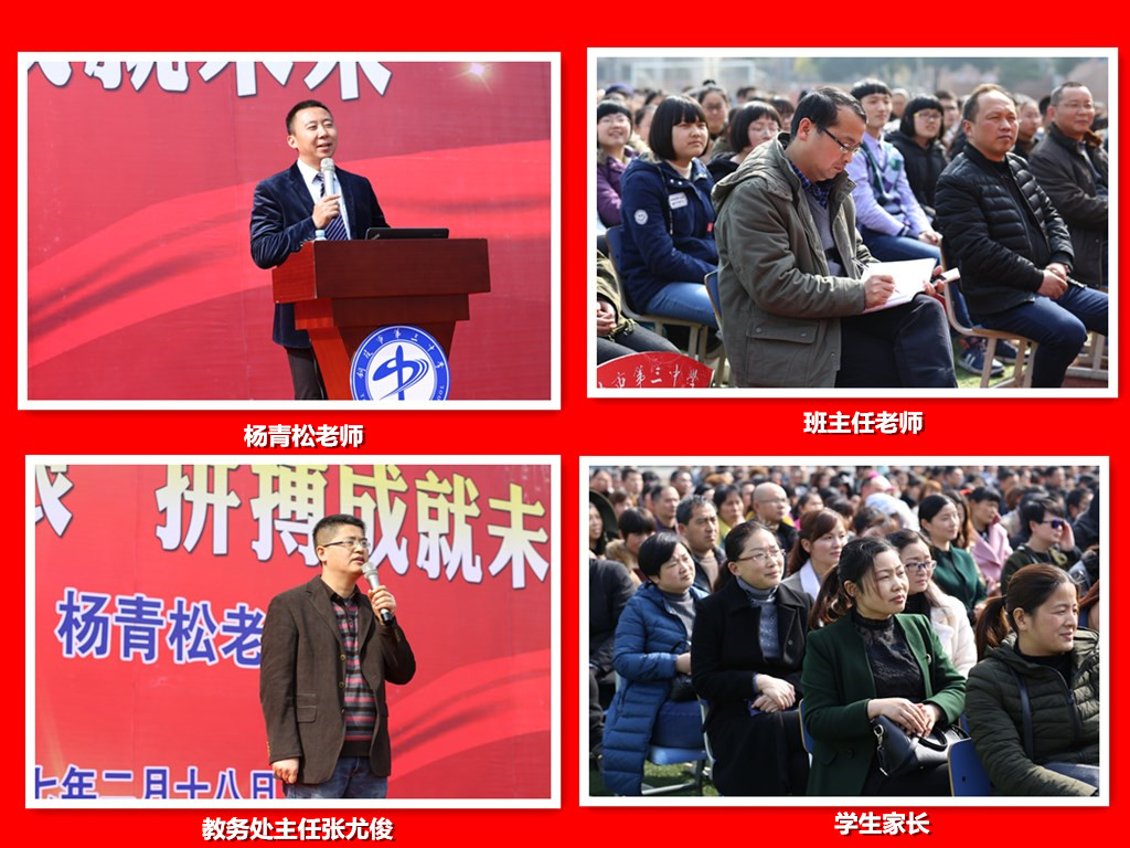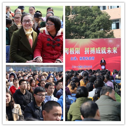 2月18日下午,初春的三中校园惠风和畅,阳光灿烂。我校邀请全国著名励志演讲家杨青松老师给2017届高三全体学生、家长做《挑战高考极限》的演讲报告会。副校长叶叶、教务处副主任江选安、高三年级部部长胡晨、副部长潘鸣皋以及高三全体班主任和教师参加了报告会。教务处主任张尤俊主持报告会。