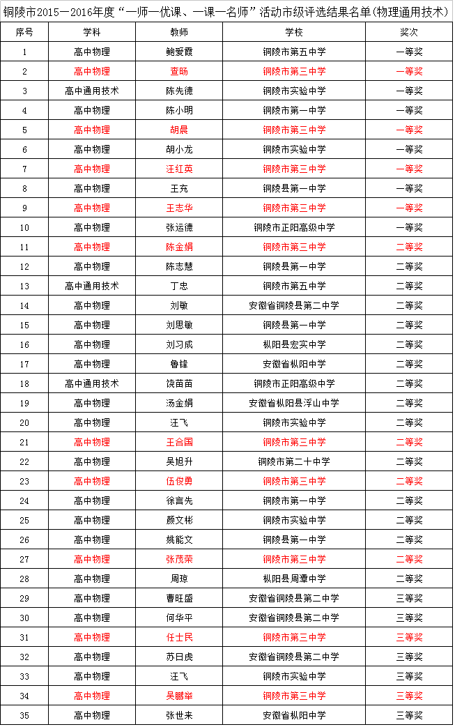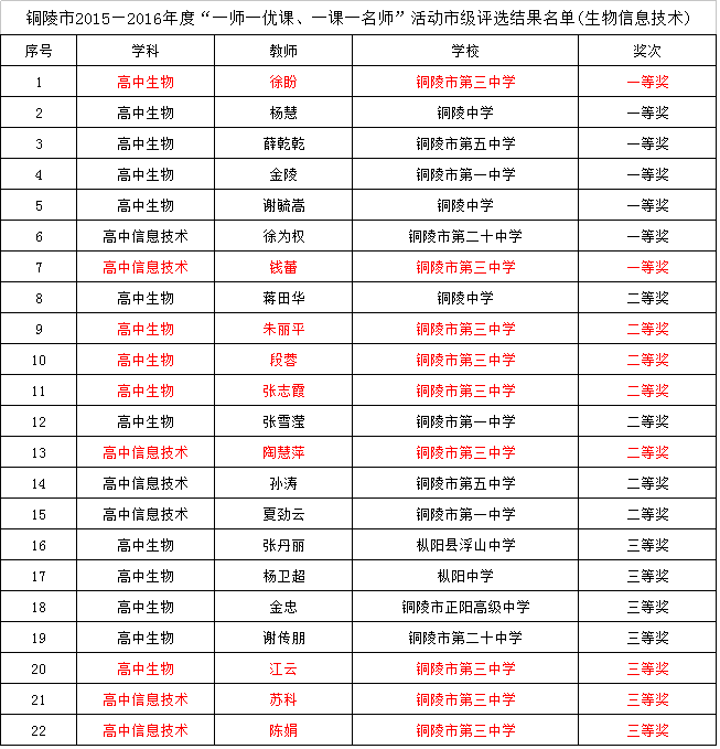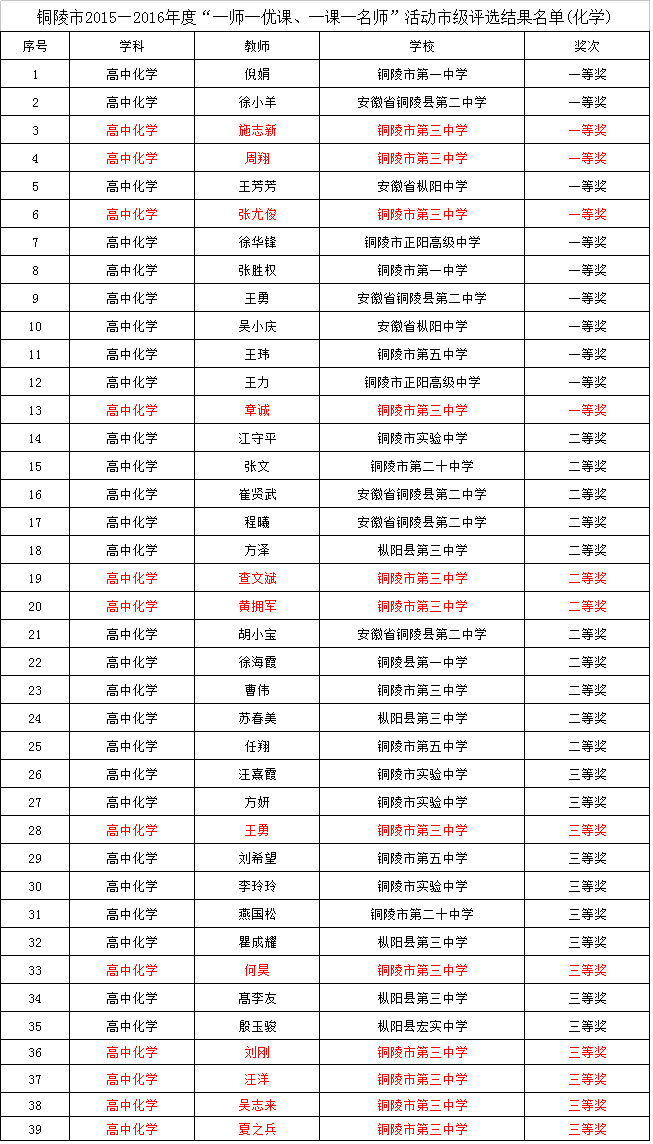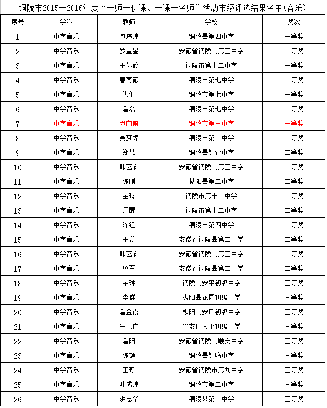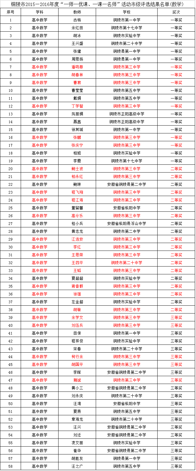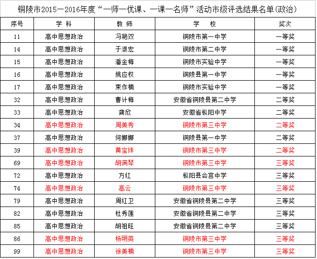 近日,市教育局公布了2015—2016年度“一师一优课、一课一名师”活动市级评选结果的名单。在省优、部优的评选基础上,结合县区教育主管部门和市直各校逐级推荐、专家组在线评审意见,决定对铜陵市2015—2016年度“一师一优课、一课一名师”活动开展市级评奖,共评选出等级奖2312个,其中,我市高中部市一等奖78个,二等奖86个,三等奖77个。我校一等奖29人,二等奖31人,三等奖21人,其中获省部级奖的共有25人次。我校在本次活动中因成绩突出而被授予“优秀组织奖”。获奖名单见附件。