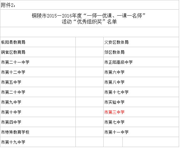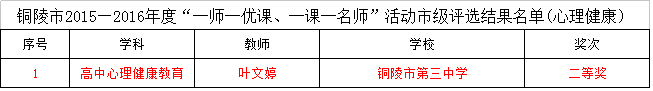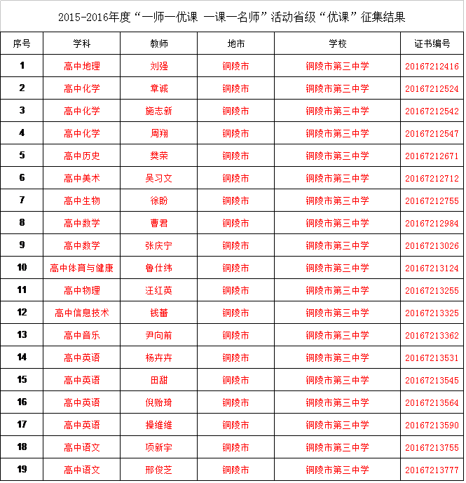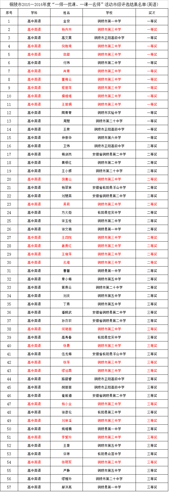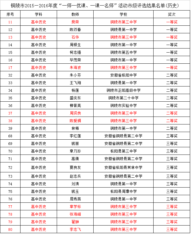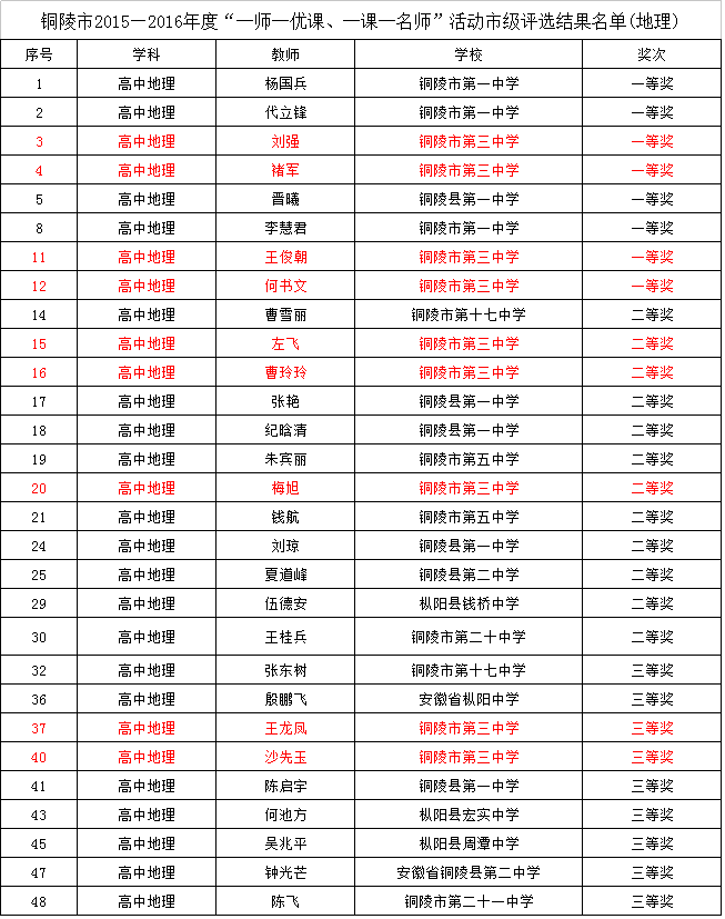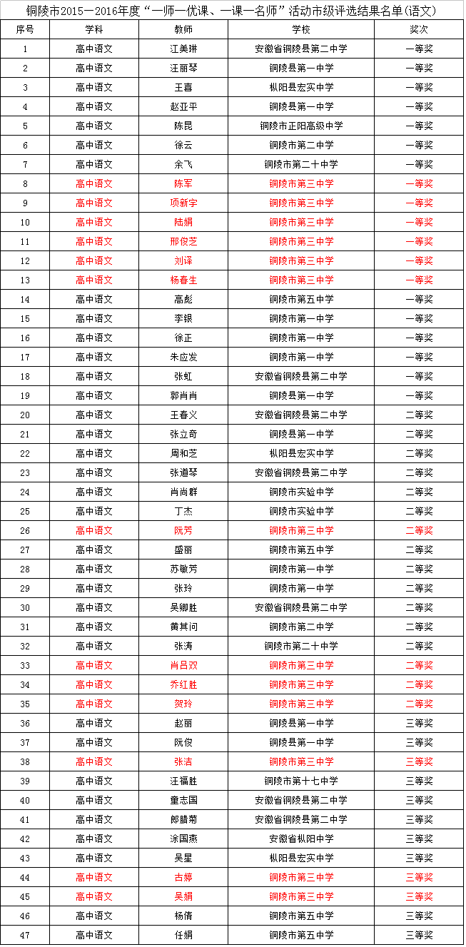 近日,市教育局公布了2015—2016年度“一师一优课、一课一名师”活动市级评选结果的名单。在省优、部优的评选基础上,结合县区教育主管部门和市直各校逐级推荐、专家组在线评审意见,决定对铜陵市2015—2016年度“一师一优课、一课一名师”活动开展市级评奖,共评选出等级奖2312个,其中,我市高中部市一等奖78个,二等奖86个,三等奖77个。我校一等奖29人,二等奖31人,三等奖21人,其中获省部级奖的共有25人次。我校在本次活动中因成绩突出而被授予“优秀组织奖”。获奖名单见附件。