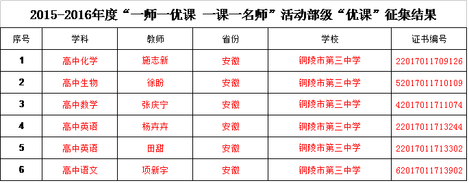 附件1:铜陵市2015—2016年度“一师一优课、一课一名师”活动高中部获奖名单