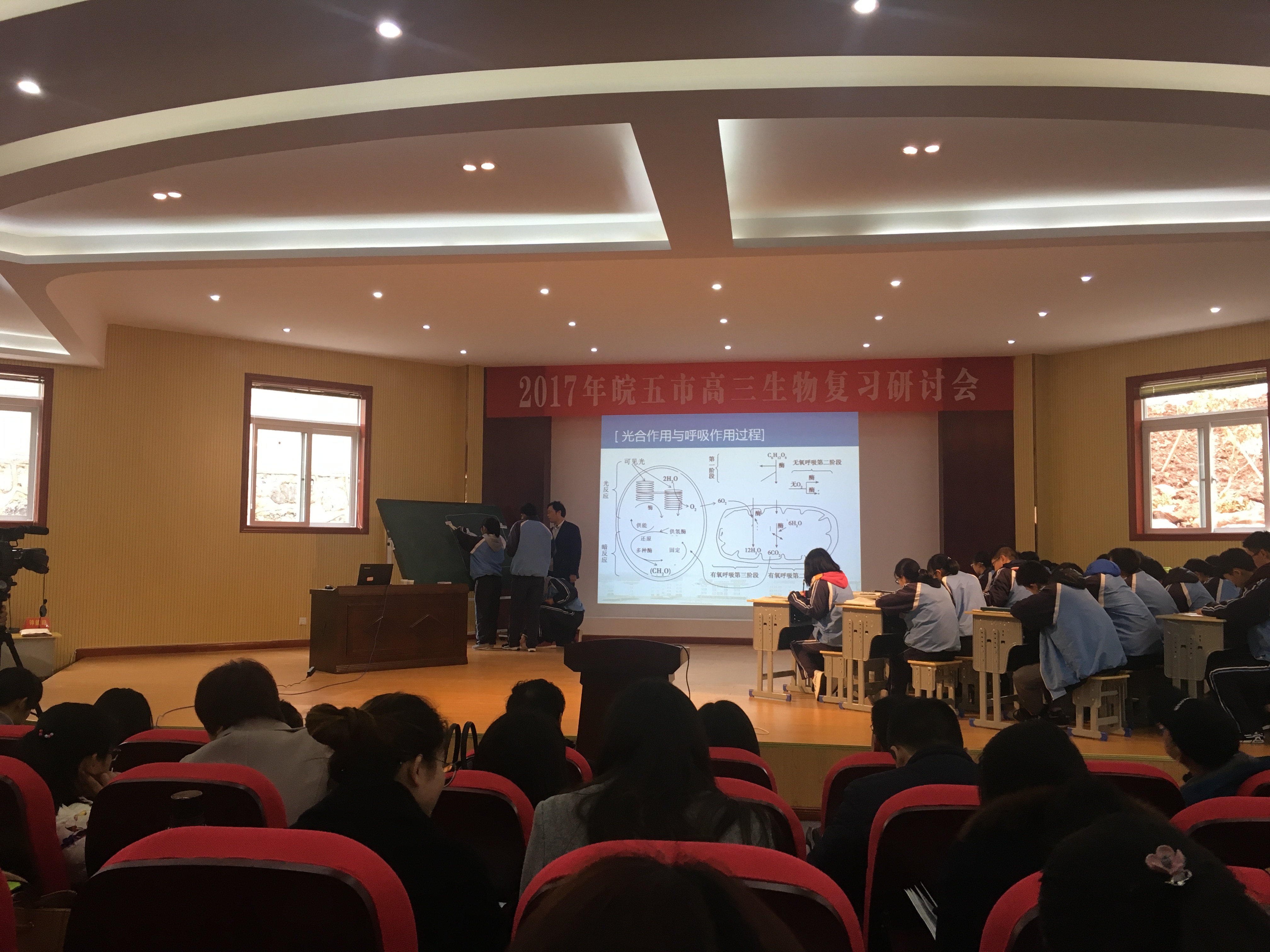研讨会由三项内容构成。第一项为名师讲座。来自五市的优秀教师针对高三复习过程中遇到的问题及复习策略进行分析与总结。阜阳一中的周正波老师,铜陵实验高中的殷康俊老师,滁州一中的汪兴兰老师,芜湖一中的孙鹏飞老师分别从高中生物四大模块内容的考纲入手,梳理主干知识,构建知识网络,呈现出知识的整体结构。并结合教学实际,对复习过程中学生出现的具体问题,进行针对性的总结与归纳,从中寻找突破口,提出相应的复习策略与方法。他们展示了这些策略与方法的具体实施过程及教学效果,引发与会老师们的激烈讨论,让后期的复习目标更加明确。来自绩溪中学的汪朝晖老师,精选出部分典型的高考真题,剖析了试题的出题意图、方式及考察的主干内容,从而对考纲做出有针对性的解读。