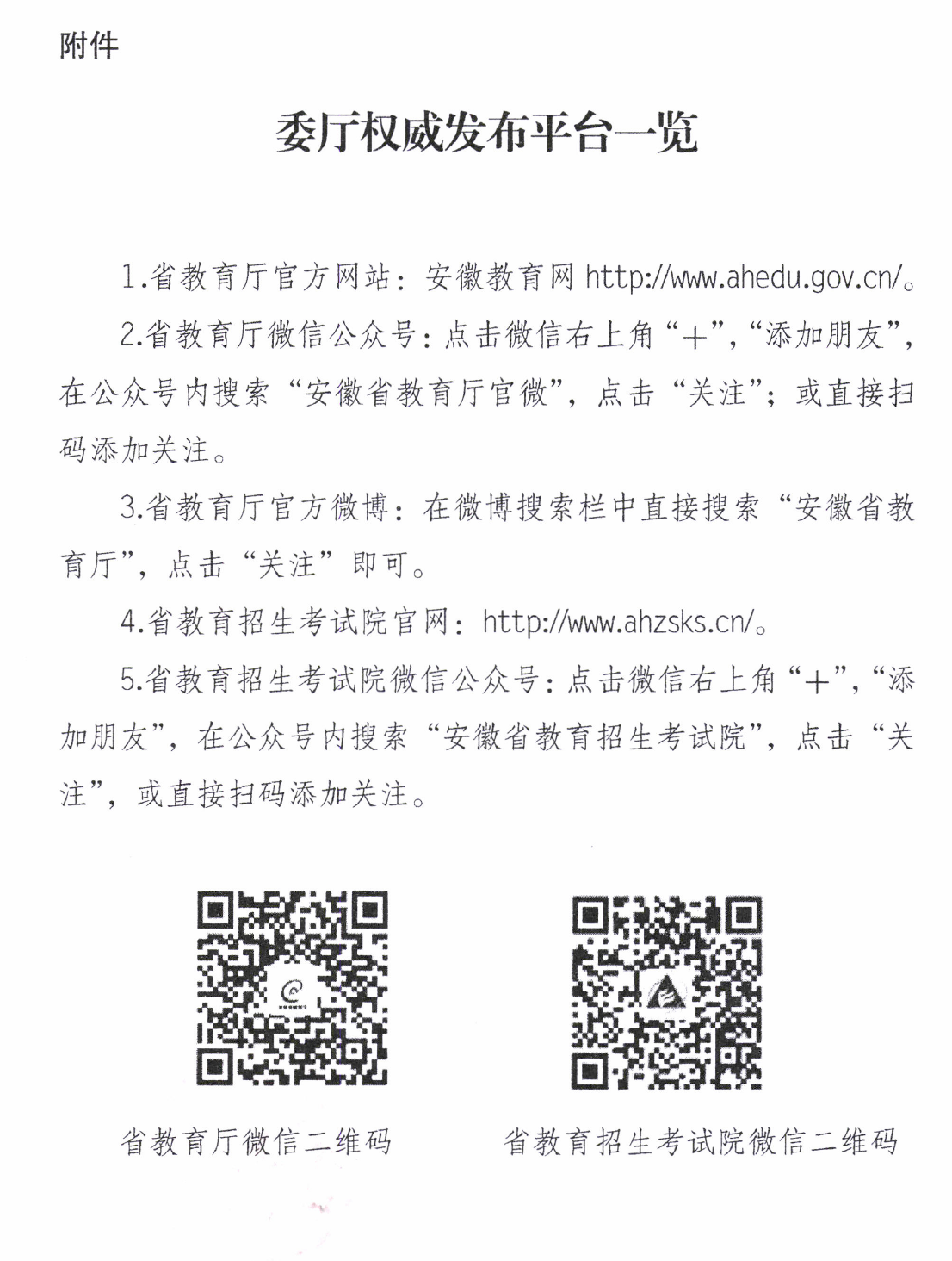 省教育厅“两微一网”(省教育厅政务微博、微信公众号和安徽教育网)是委厅推进政务公开、解读教育政策、发布权威信息、开展便民服务的重要平台,为最大限度地提高权威信息的传播力和影响力。请扫码关注,并通过朋友圈、QQ群等自媒体予以转发。