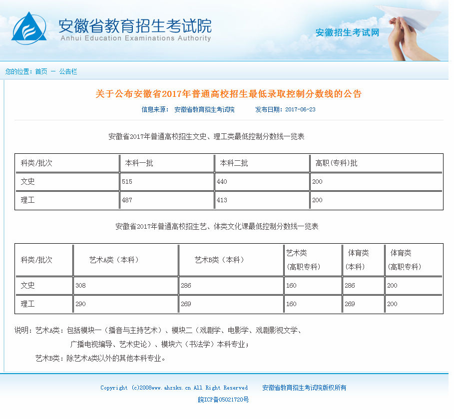 关于公布安徽省2017年普通高校招生最低录取控制分数线的公告