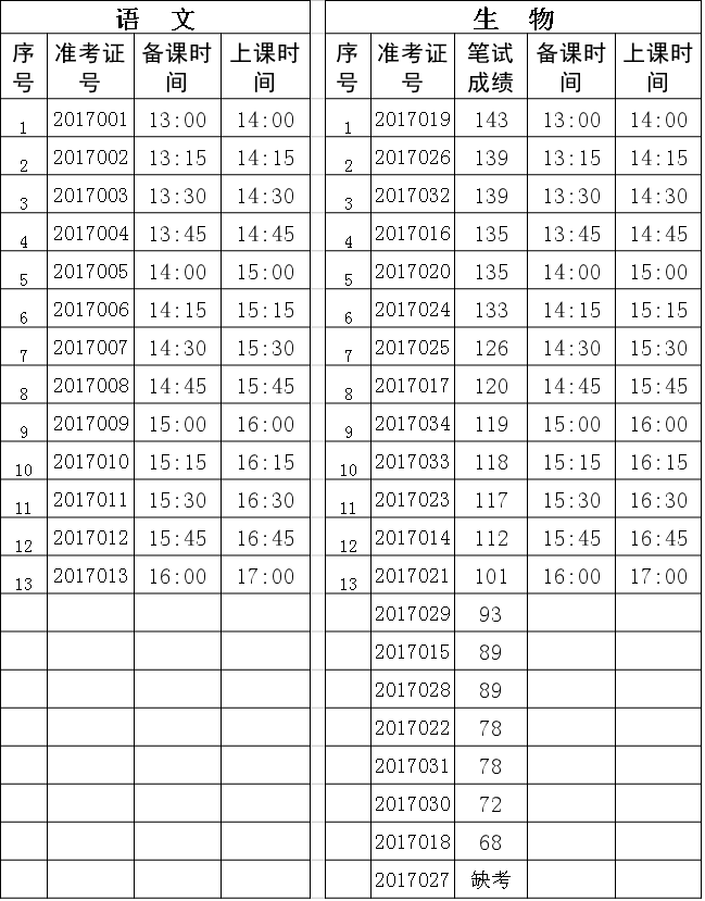 2017年铜陵市三中教师招聘面试时间暨生物面试成绩