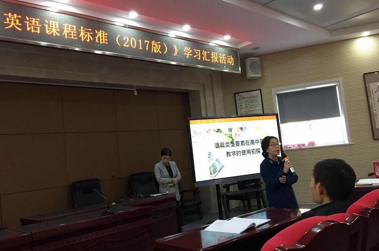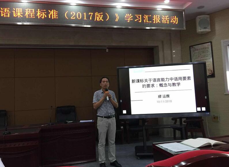 10月11日,铜陵市教科所英语学科组组织的《普通高中英语课程标准(2017版)》学习汇报活动在市一中成功举办。活动由英语教研员章全老师主持,全市高中英语教师近100人参加了此次交流学习活动。 缪运霖老师代表我校外语组谈语用知识的内涵与教学,受到与会教师的好评。