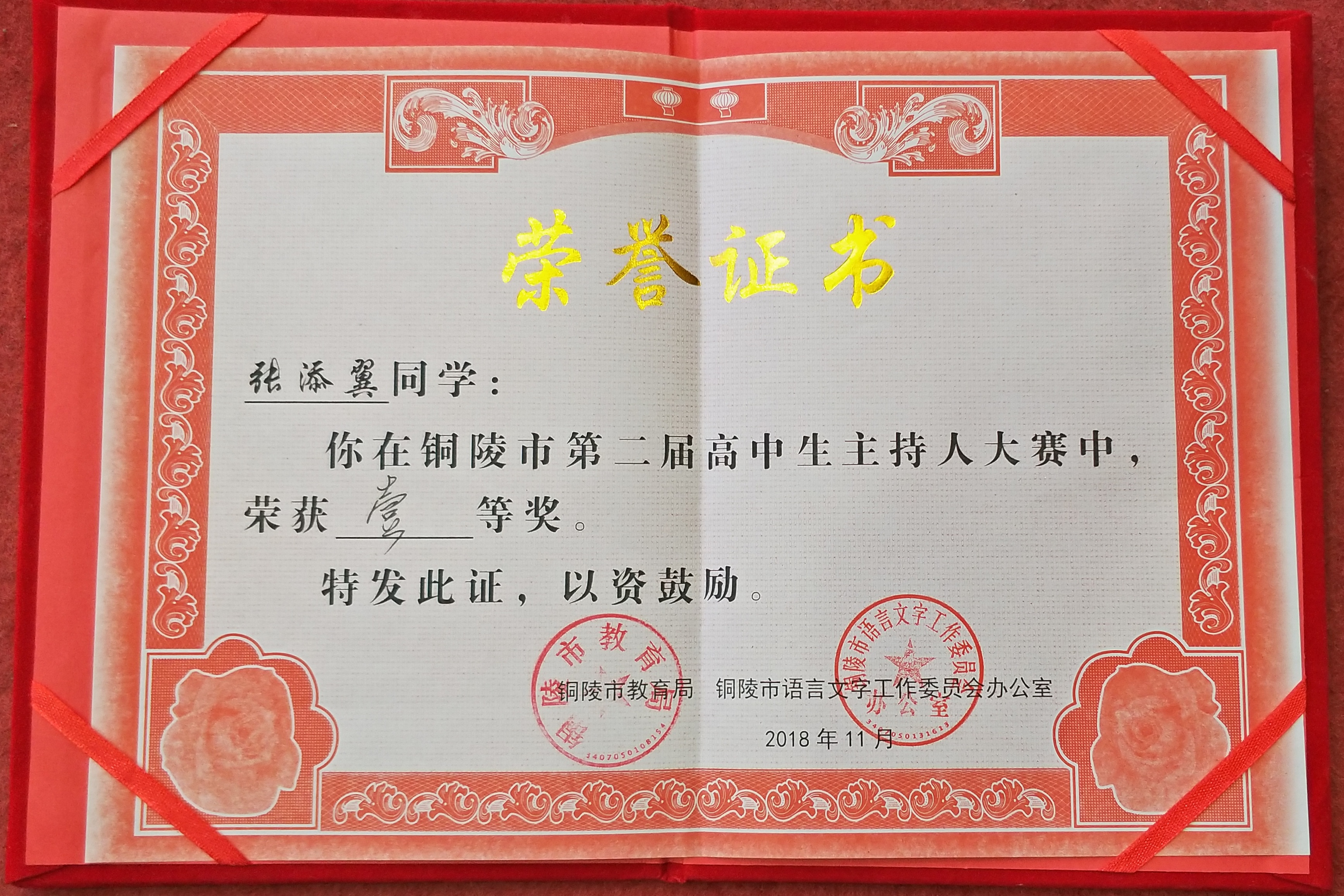本校讯 在刚刚结束的铜陵市第二届高中生主持人大赛中,我校学生张添翼凭借出色发挥,获得了第一名的优秀成绩,高一的其他三名同学3班曹琳、蔡娆、陈茜雯获得了三等奖,因外联科的精心组织,我校还获得了“优秀组织奖”。