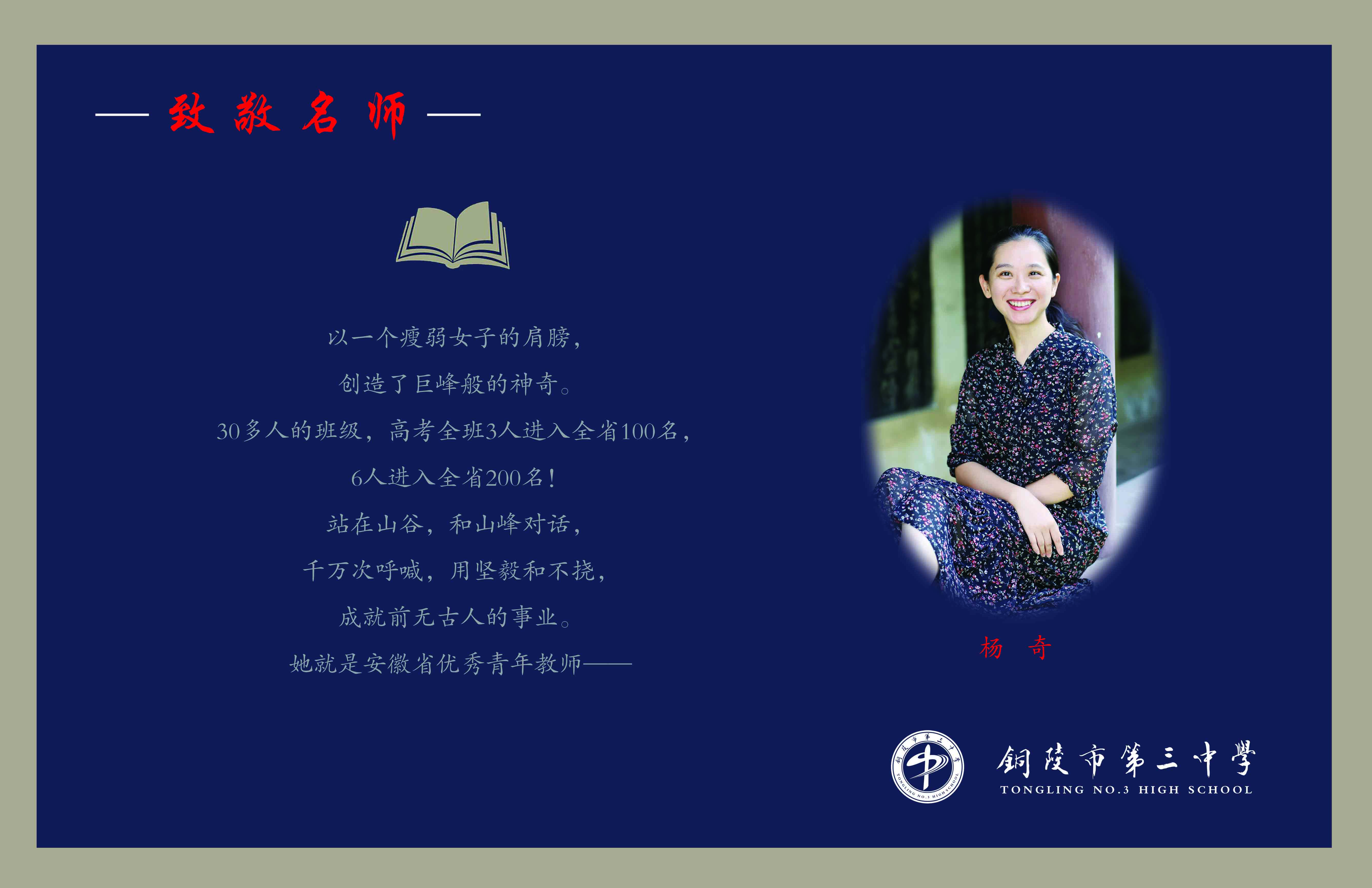 其实哪有什么岁月静好,只是有人替你负重前行。每个悄然成名的英雄背后,都会站着一群默默支持他的人,杨奇老师也不无例外。全班34名考上一本的显赫成绩背后,是她3年潜心的付出,是她付出的所有真情回报,是她热爱三中的最好体现。她用行动为三中献出了一份满意的答卷,三中因她而更加精彩,她因身在三中而更加自豪!成绩的背后是积极支持她的家庭,信任她的领导,寄托全部希望的学生,而今,她终于没有让大家失望。当有人见到她爸,惊讶地说道:“原来杨奇就是你女儿呀?!”她爸只回了句:“你可知道她背后有一个强大的后勤团?”全家都在背后默默地支持着她,一千多个日日夜夜,她把几乎所有的时间都奉献给了学生,陪伴她们度过整整三年。每天早上六、七点钟就从家出发,晚上十点半以后才回到家,无暇顾及父母,无心照看孩子。“宝剑锋从磨砺出,梅花香自苦寒来。”回想这走过的一千多天,她的眼里噙满了泪水。个中的辛酸,只有她自己能够深切体会。