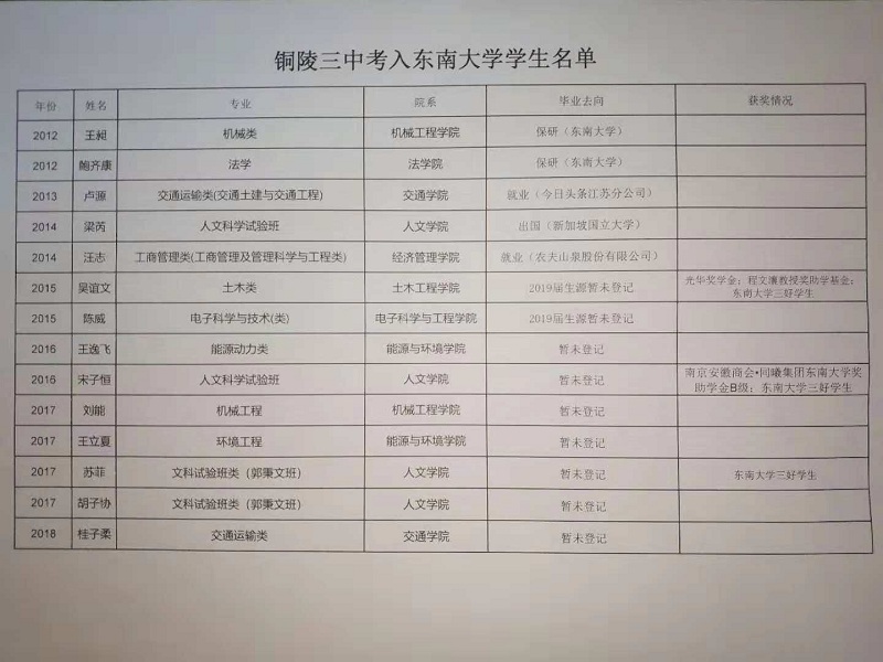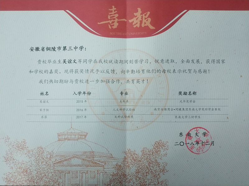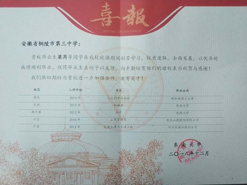 蔡亮教授还送来了梁芮、吴谊文等三中毕业生在东南大学刻苦学习获得优秀成绩的喜报,充分赞扬了铜陵市三中近年来的教育教学业绩,希望将来有更多的优秀学子报考东南大学。