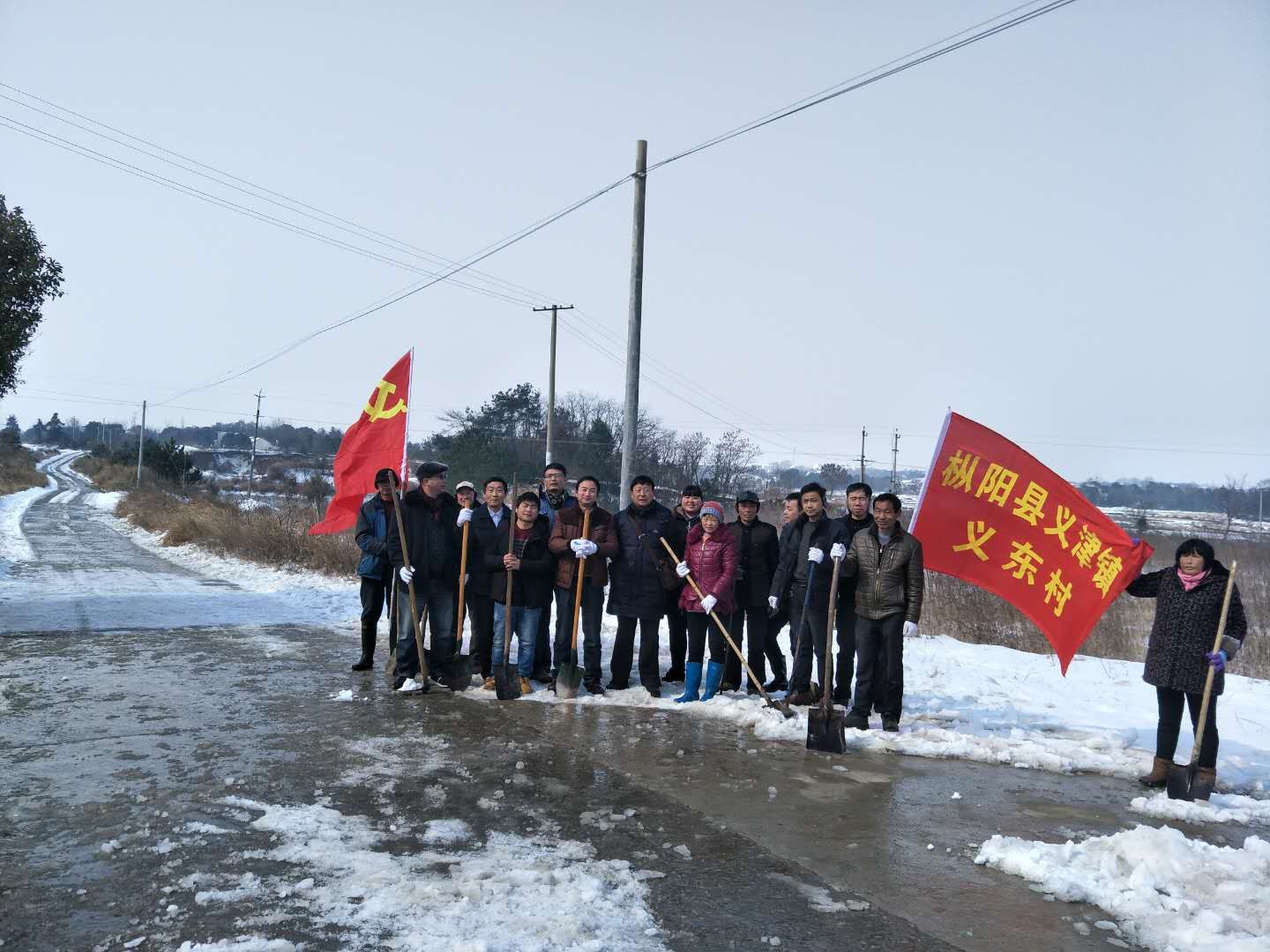 1月30日,枞阳县义津镇义东村党委书记李经邦同志与市三中驻村扶贫工作队长林强同志带领村两委干部及党员志愿者在经过我村的交通要道-----“义浮路”上扫雪除冰,确保道路畅通!