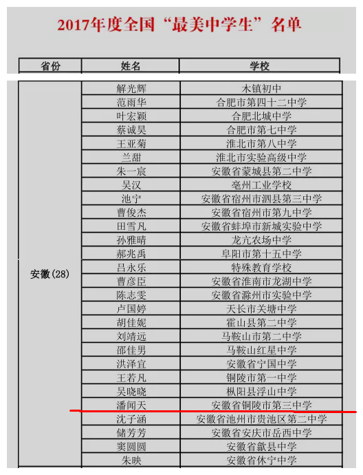 少年的胸怀包藏宇宙,少年的足迹踏遍千山,少年的光彩洒彻原野。唯有视野博大,方能成真才;唯有武艺百般,才可立稳于时代。潘闻天同学除品学兼优外,还积极参加社会实践,做全面发展的最美中学生。他关心时事,密切关注包括自己在内的当代中学生群体,和同学共同完成课题《社团绘画课程对高中生心理健康的影响初探》获2016年安徽省青少年科技创新大赛二等奖。他多才多艺,2015年10月取得少儿声乐专业八级证书。2016年7月在铜陵市第二届中小学生羽毛球锦标赛中,荣获初中组男子单打第三名。擅长播音主持,口才音质佳,在第二十四届校园文化艺术节中担任主持人,并荣获一等奖。潘闻天同学是新时代中学生的突出代表,他的身姿更是出现在各种国内外交流活动上。在与英国圣查德中学访问团师生互动时,他落落大方,器宇不凡,一展歌喉,奉献了精彩的节目。2017年5月,他作为优秀学生代表随校长访问团赴瑞典、芬兰进行访问,期间出色的表现给外国师生留下了良好印象。2017年8月,市教育局组织近50名师生赴枞阳开展“放飞中国梦,传承红基因”的主题教育活动,他作为铜陵三中的唯一学生代表参与了此次意义深远的活动。