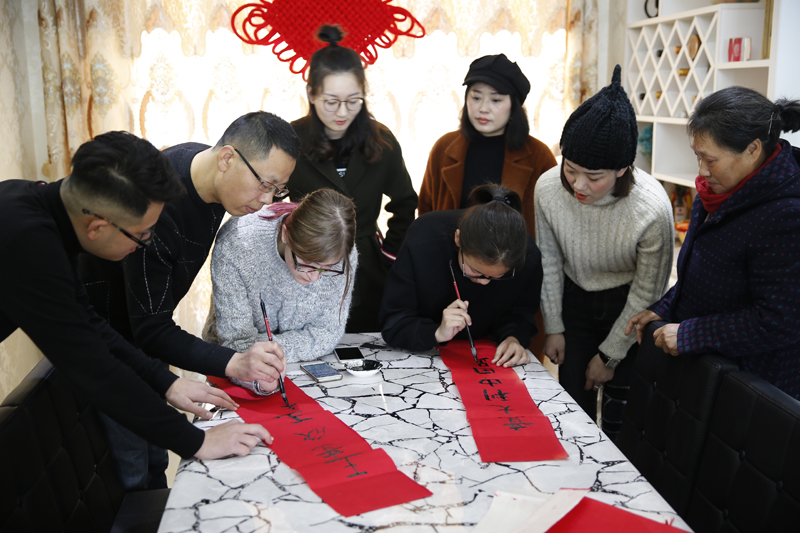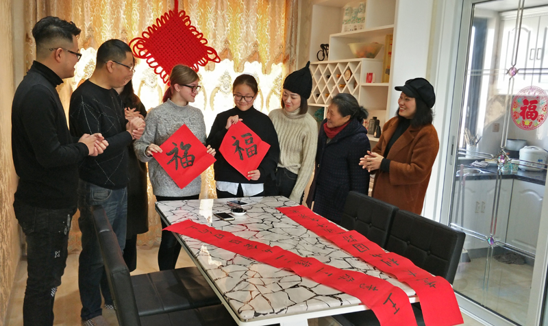 意大利女孩Giorgia Restivo和接待家庭王豫同学全家写春联,贴福字儿