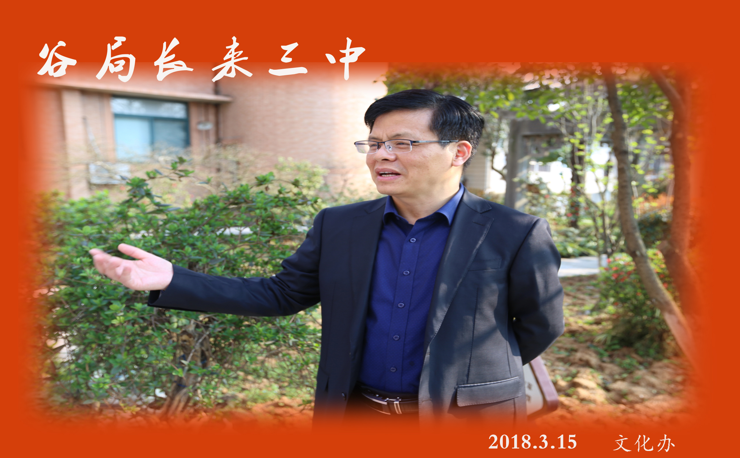 三月的三中校园,春意盎然,到处涌动着绿色和生气。3月15号下午,市教育局党委书记、局长谷越,局党委委员、工会主席郑国,局党委委员、副局长程克勤及相关科室负责人来三中调研,在学校领导班子成员钟士标、叶叶、张国荣的陪同下,谷局长一行首先实地察看了我校的校容校貌,通过走访体育馆、植物园、五松山文化碑廊、生态馆等教学设施了解我校办学历程和取得的丰硕成果。