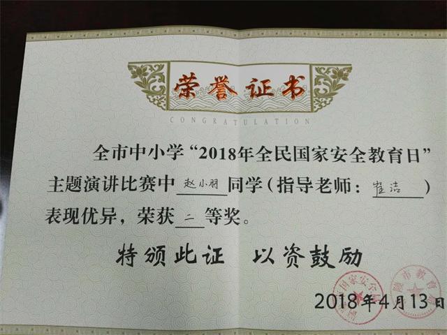 来自全市的中小学学生参加了角逐,我校高二(16)班的赵小羽同学荣获第二名的好成绩(指导教师:崔洁)。比赛中,赵小羽同学深情并茂,自信从容,表达了对国家安全主题的深刻理解,她的精彩表现,搏得了在场评委老师和同学们的阵阵掌声。