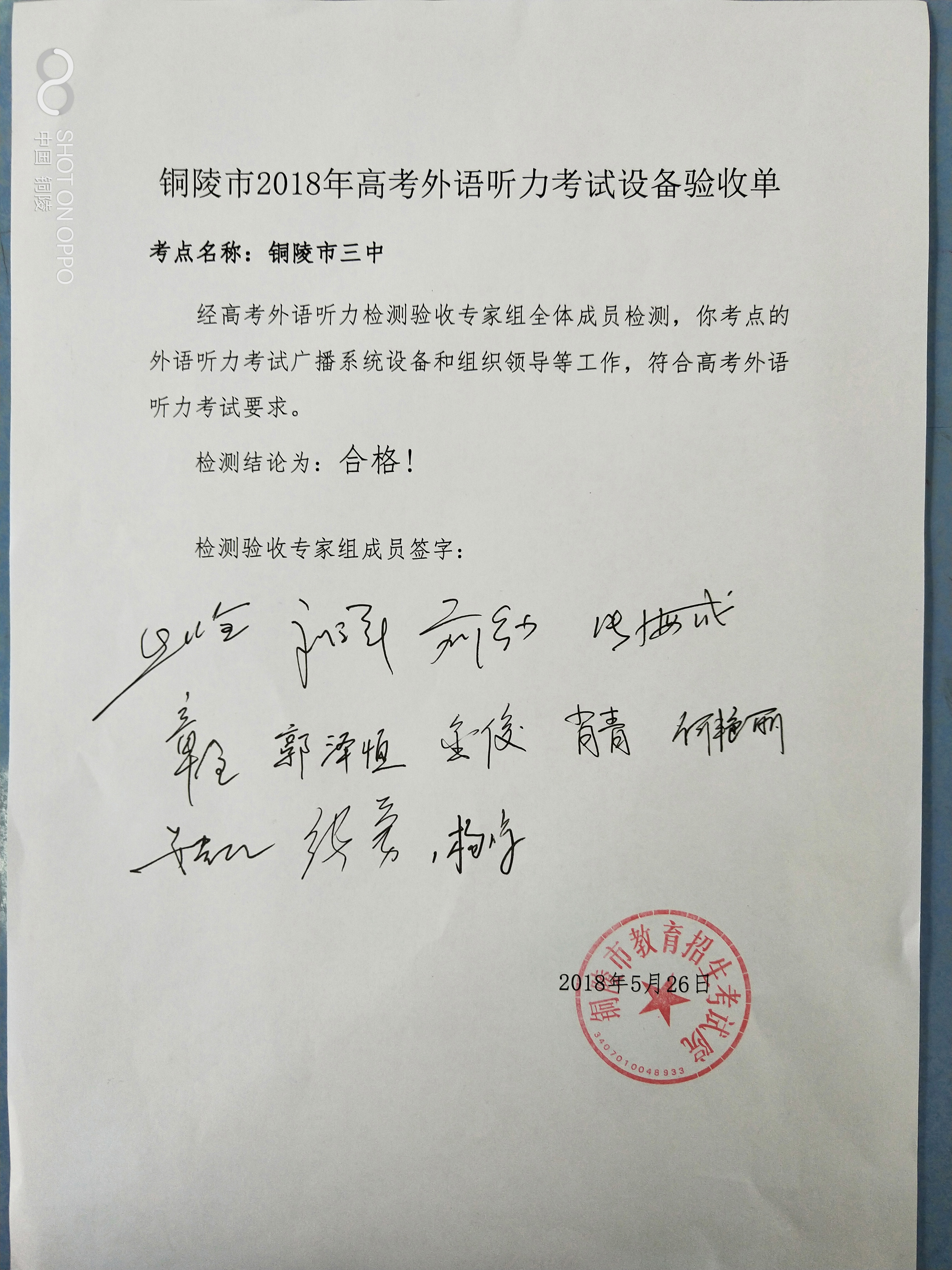 5月26日上午,市教育招生考试院、教育信息技术中心和监察室等领导一行,对我校2018年普通高考外语听力考试广播设备进行检查验收,并对相关工作给予了充分的肯定。经验收领导小组全体成员检测,铜陵三中所设考场外语听力考试设备和组织领导工作符合文件要求,检测合格,通过验收。
