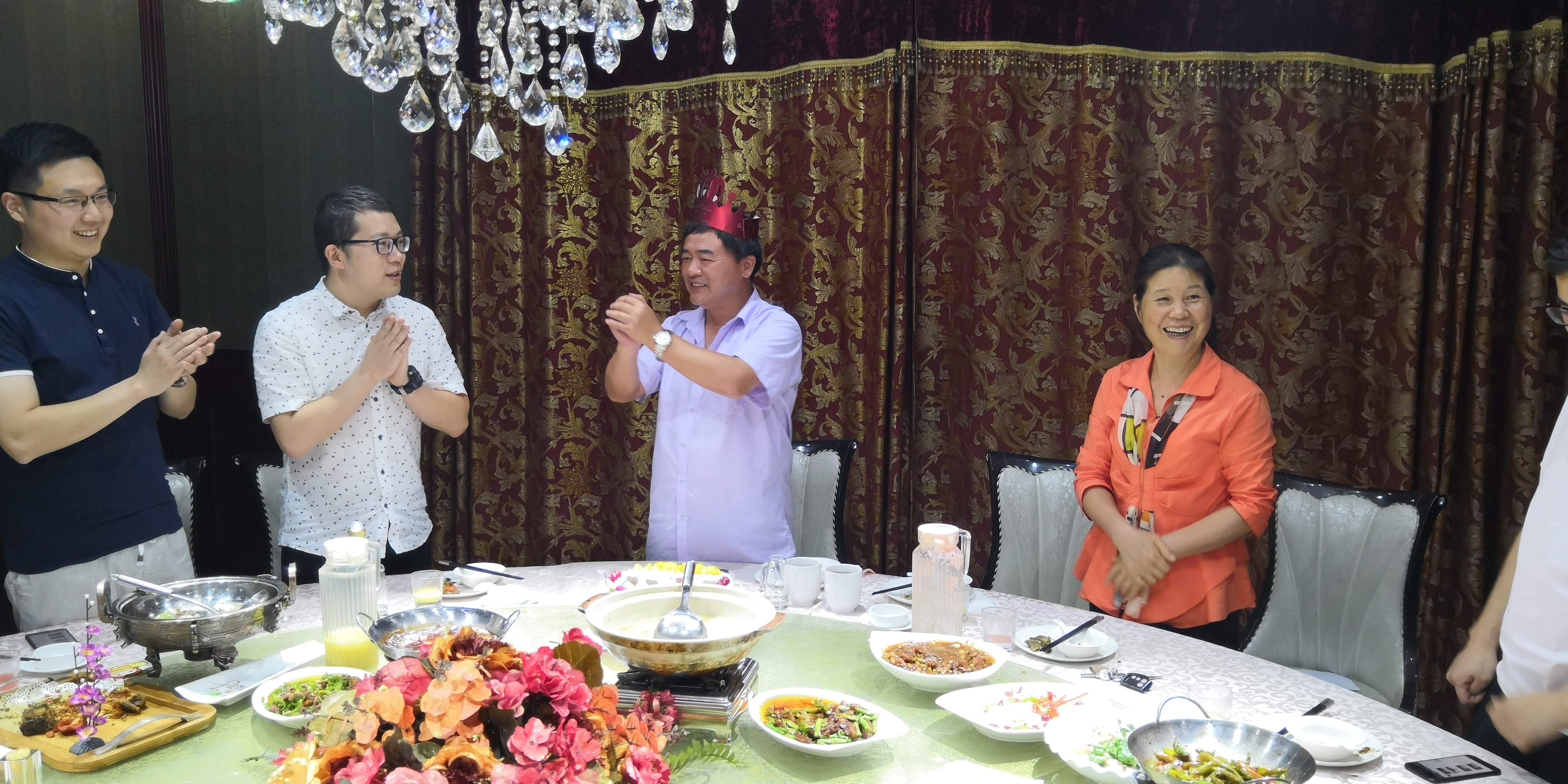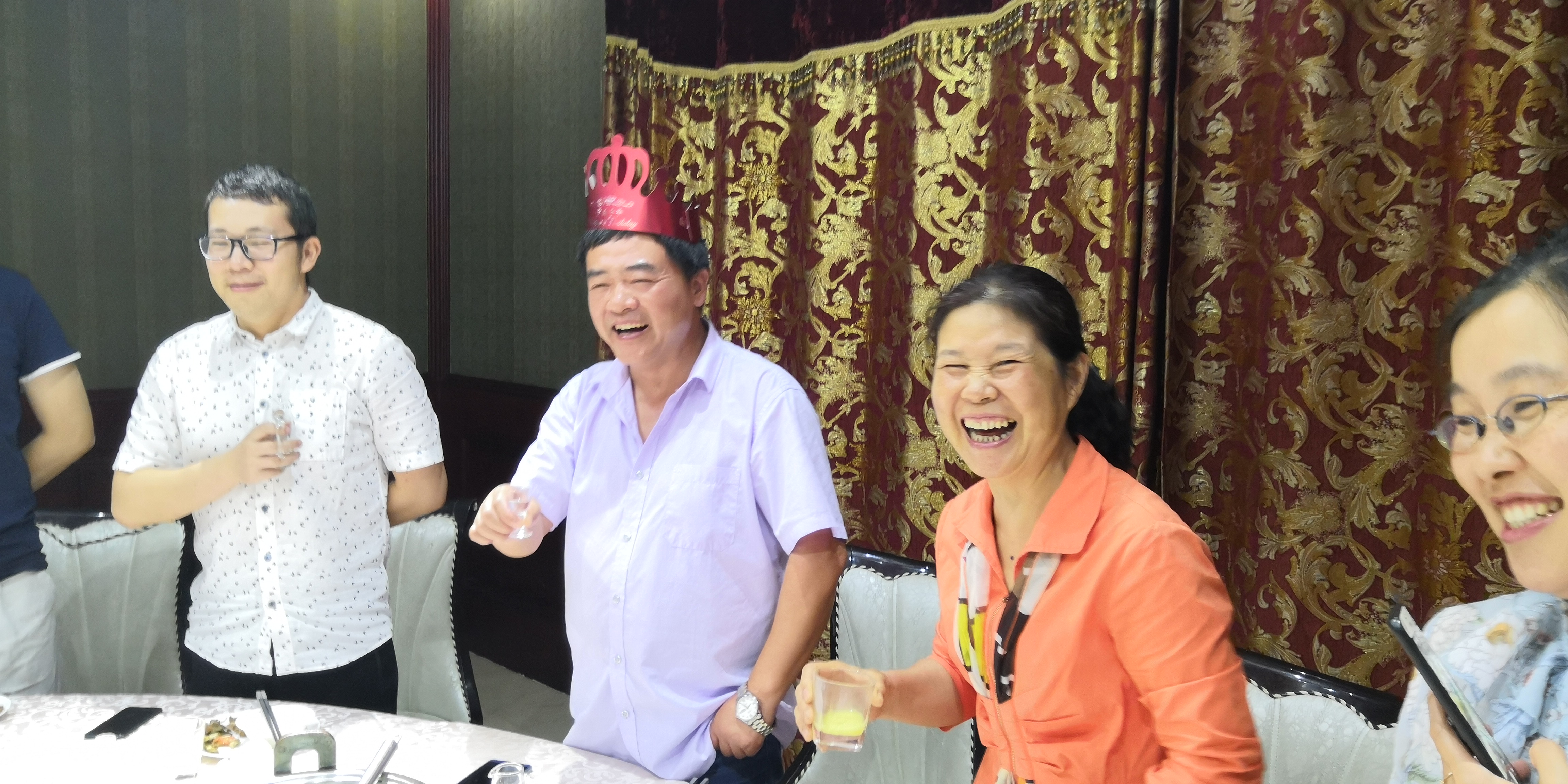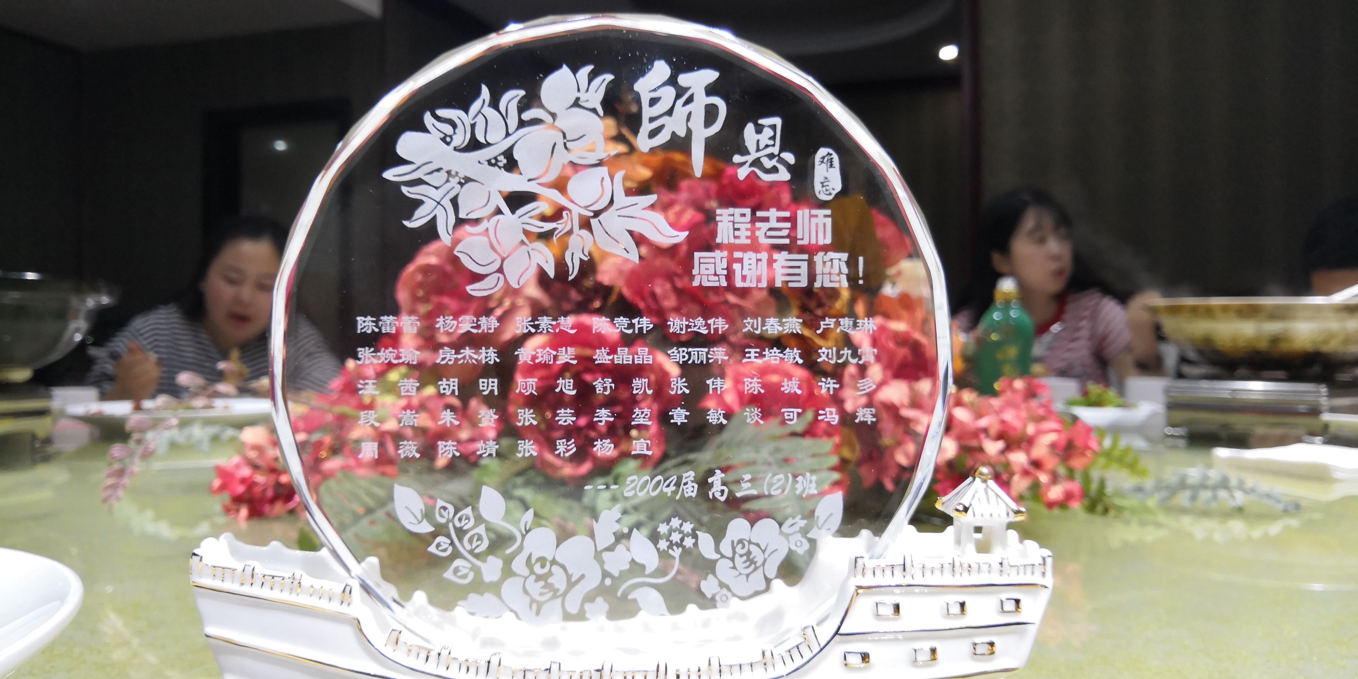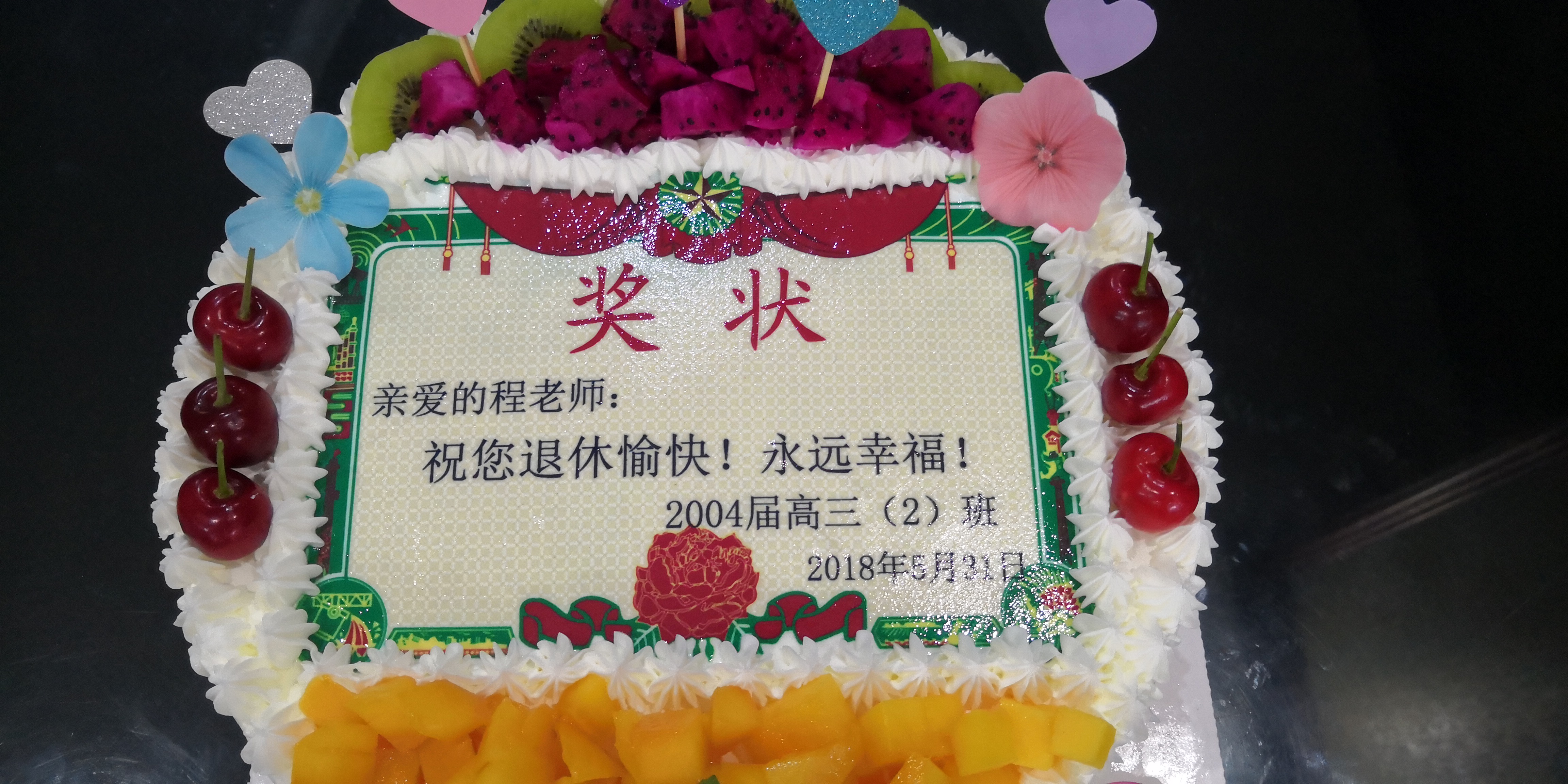 2018年5月31日晚,铜陵某酒店宴会厅内灯火辉煌,氛围温馨而喜庆,一席特殊的宴会正待开席。圆形餐桌中央,一簇鲜花格外灿烂,散发出淡淡的清香; 一款大型蛋糕精美艳丽,四周是车厘子、火龙果、黄橙等各式水果,中间镶嵌着一幅特殊的“奖状”:”亲爱的程老师,祝您退休愉快!永远幸福!”一个水晶工艺摆件十分精致,上刻“师恩难忘“的字样,透发出浓浓的师生情谊。