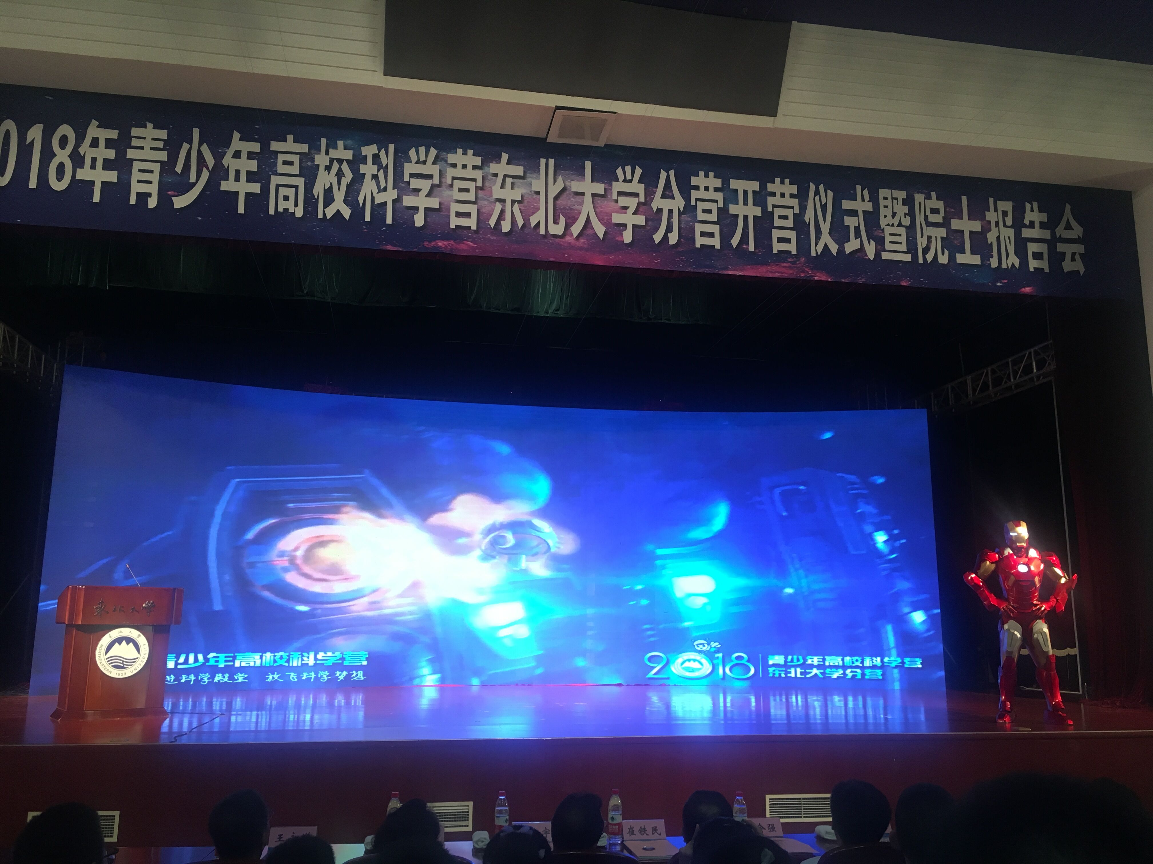 今年是东北大学承办科学营的第七个年头,同时也恰逢建校95周年,为了以更好更新的风貌迎接科学营和营员师生,为校庆献礼,本届科学营对主题与活动进行了全新设计与呈现,主题确定为"NEU YOUTH PIONEER"少年先锋领航派。在开营仪式上由神秘嘉宾“钢铁侠”登场介绍整体活动方案,“钢铁侠”对日程安排、前期筹备及活动意义等方面详细介绍了本次活动,让在场的同学们都大开眼界。我校凌天骢同学作为200名营员的唯一代表在开营仪式上做了发言,他号召同学们珍惜宝贵的学习机会,用心去参与和感受,多思、多想、多问,认真完成各项学习、实践任务,不虚此行,满载而归。