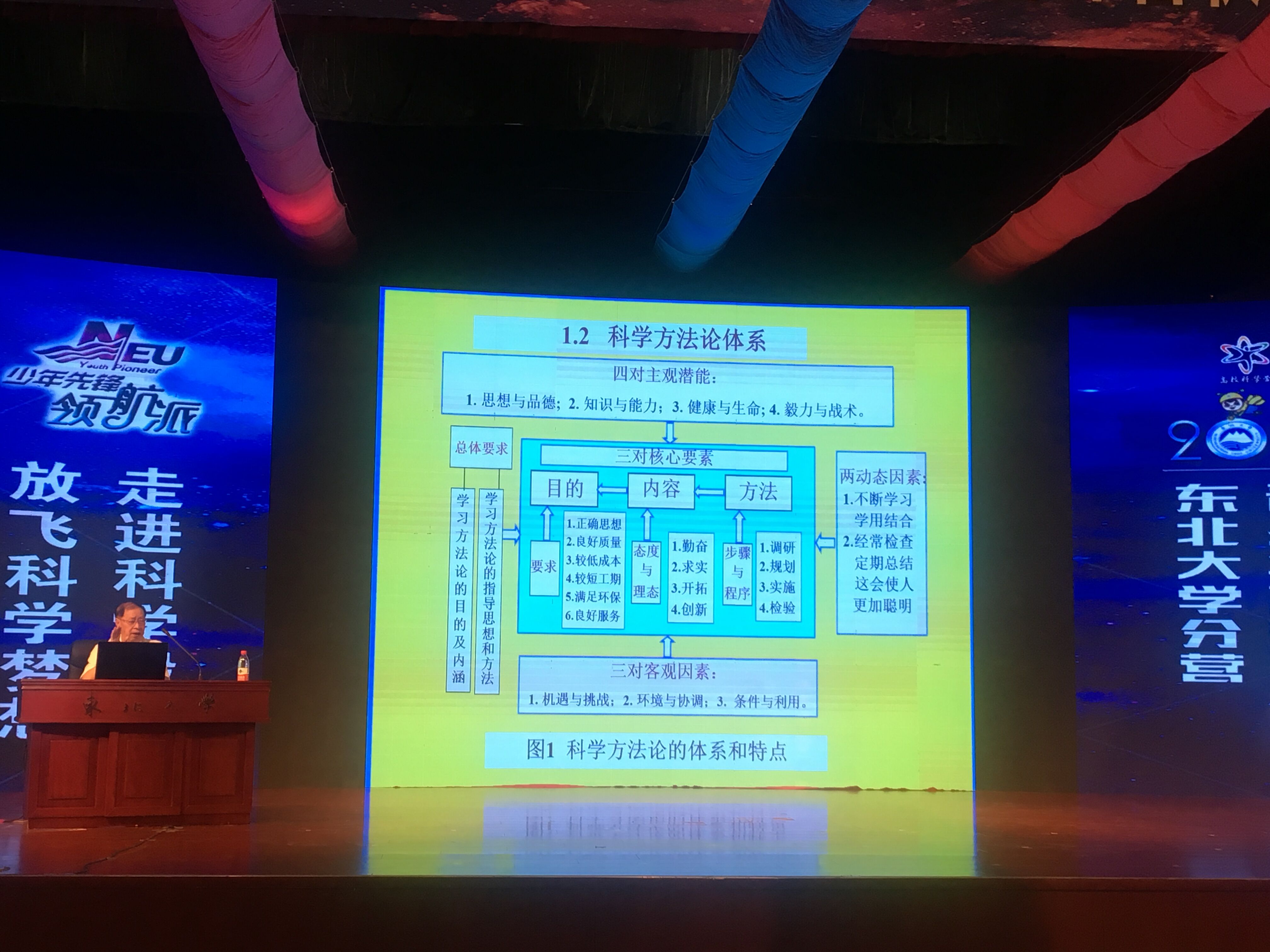 重量级学术前辈、中国科学院院士、机械动力学和工程机械专家、力学教育家、中国"振动利用工程"学科的开拓者,88岁高龄的闻邦椿教授作了以《学好用好科学方法论更好地实现人生价值》为主题的报告,闻院士鼓励少年英雄们认识到科学方法论的重要性,学习并掌握科学方法论,充分利用科学方法论的经验,告诫少年们应该以祖国建设的发展作为自己的奋斗目标,立志为中华民族的伟大复兴而奋斗,在这个过程中,实现自身的人生价值。小牛”创始人、东北大学计算机学院教授、博导朱靖波老师作了以《机器翻译,让世界语言交流无障碍》为主题的报告,报告中阐述了人工智能的的下一个里程碑,自然语言的理解、语音识别和合成,让世界语言交流无障碍的问题。精彩的报告为少年英雄们打开了一扇通往前沿技术与科技世界的大门。