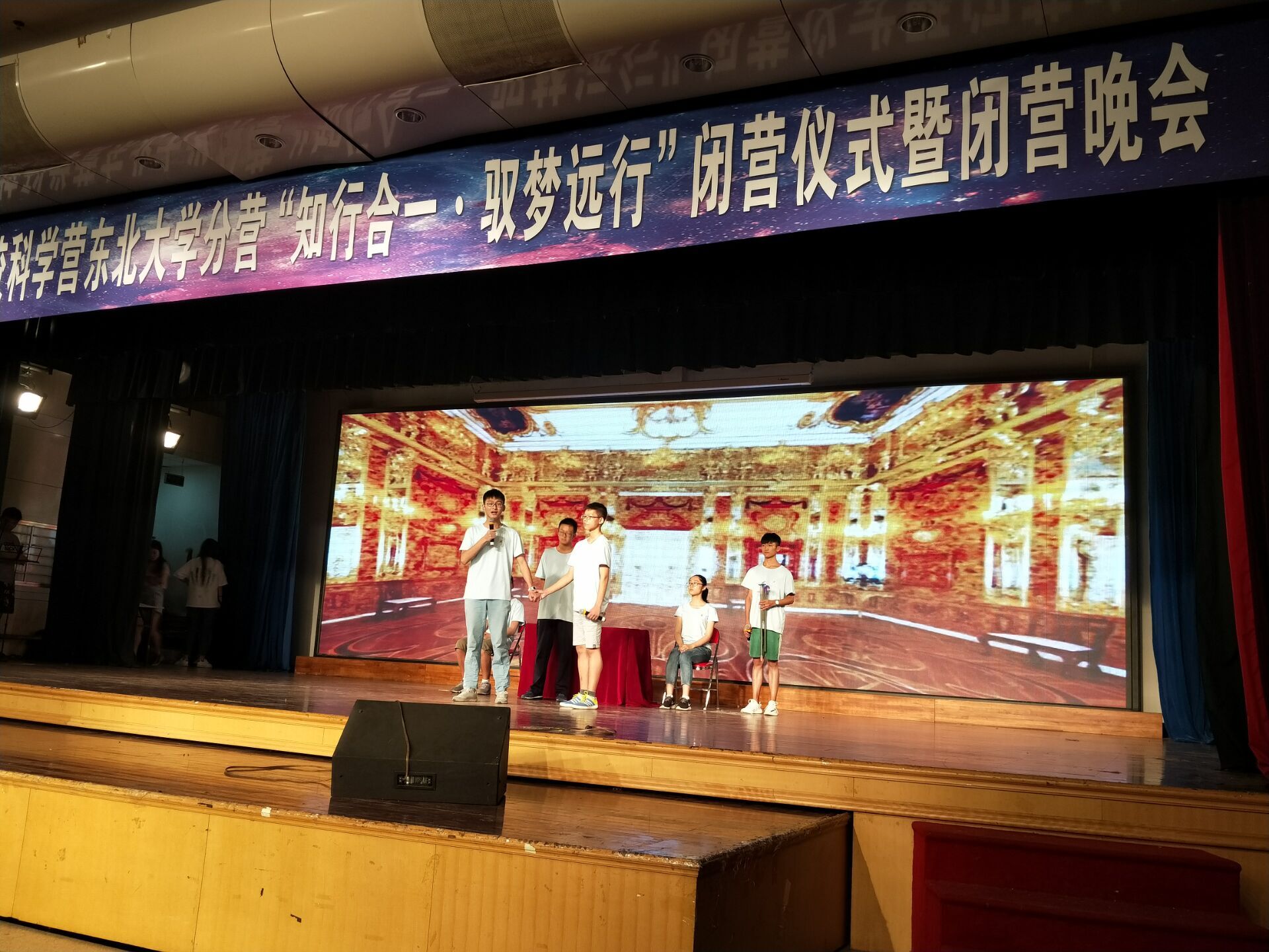在东大的最后一晚举行的闭营仪式暨闭营晚会将这次科学营活动推向了高潮。铜陵三中团队的程芷兮、凌天骢和谷朝因为这次科学营活动的优秀表现被评为“优秀营员”称号。带队老师陆彦萍也被授予“优秀带队教师”称号。随后举行的闭营晚会上来自全国的不同营队表演了精彩纷呈的各色节目,展现了营员们蓬勃的青春活力。铜陵三中营队经过前几天的紧张排练,表演的话剧《哈姆雷特》选段则具有极高的艺术表现力,博得了全场的阵阵掌声,充分展现了三中优秀学子的积极、乐观、团结、合作的风貌。