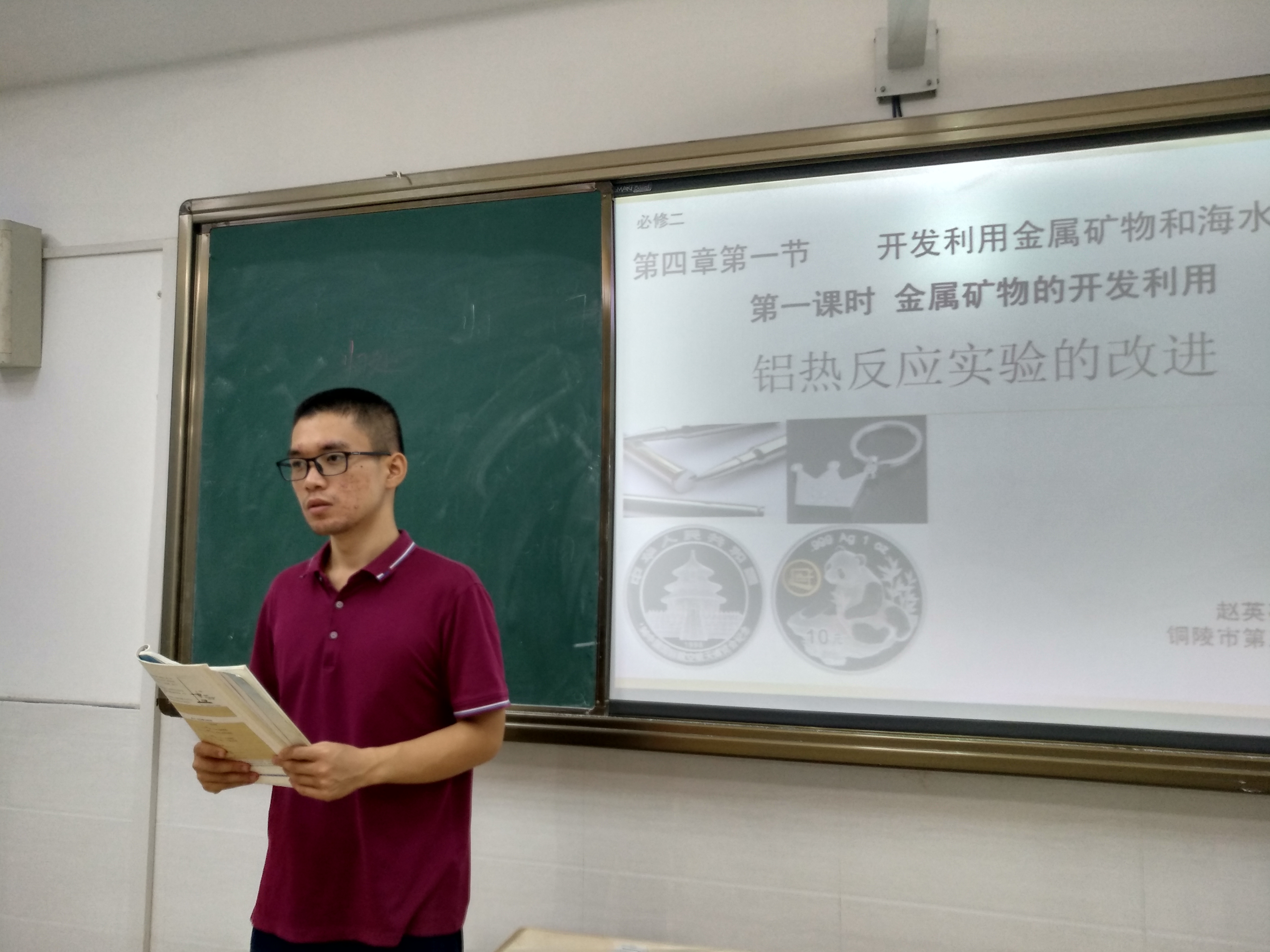 第二节课,在我校化学教研组长章诚及教研组其他老师们的精心指导下,我校新老师赵英亮锐意革新,从实验探究的角度出发进行教学设计,以《铝热反应实验的改进》为题,以电加热钨丝引发铝热反应的创新实验展示为中心,围绕如何改进教材中铝热反应实验与如何验证改进实验中铝热反应已经发生两点开展教学,与学生密切互动,启发学生自主探究并提出改进和验证方案,使学生对化学学科产生了更加浓厚兴趣,提升了学生创新意识与科学精神方面的核心素养。