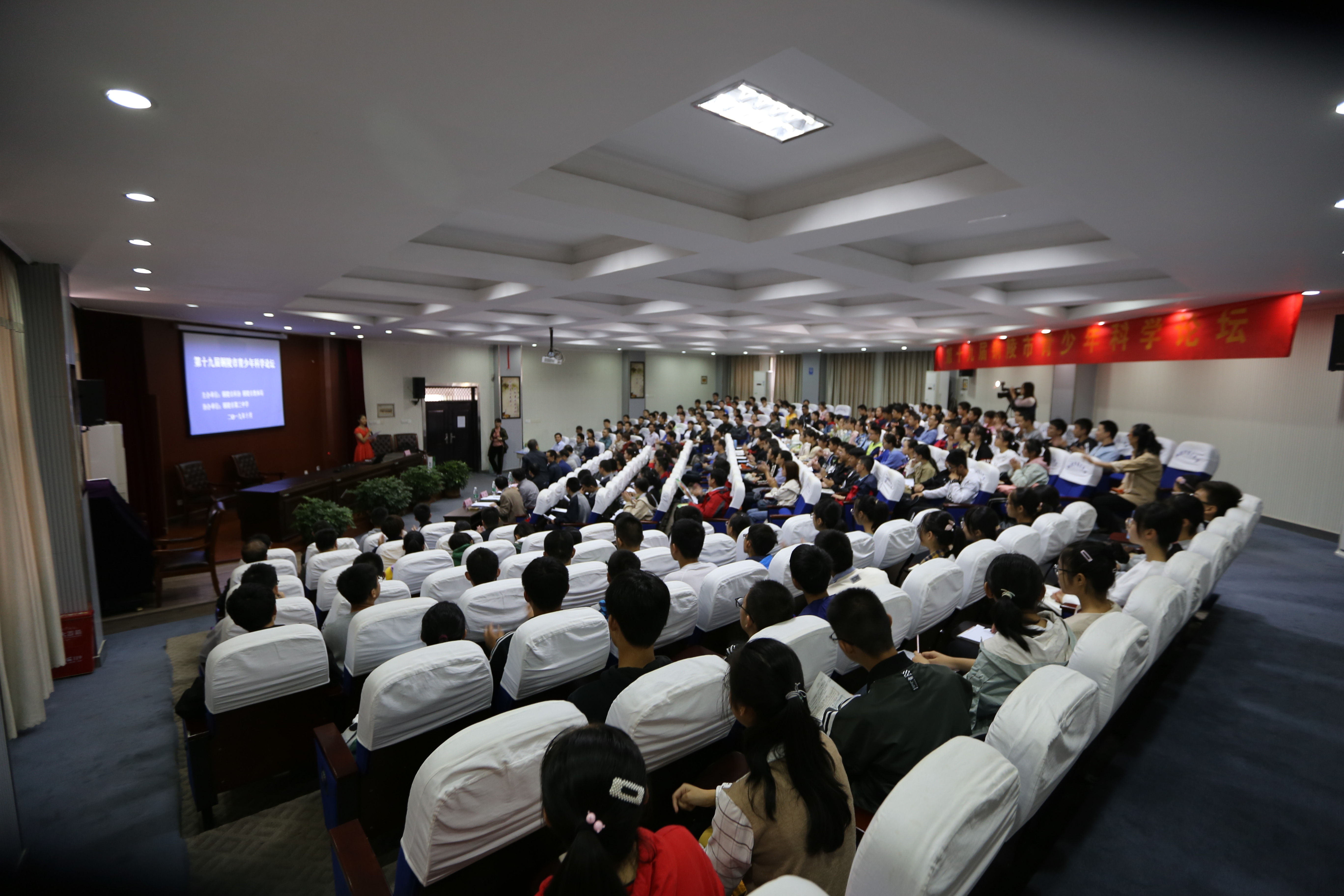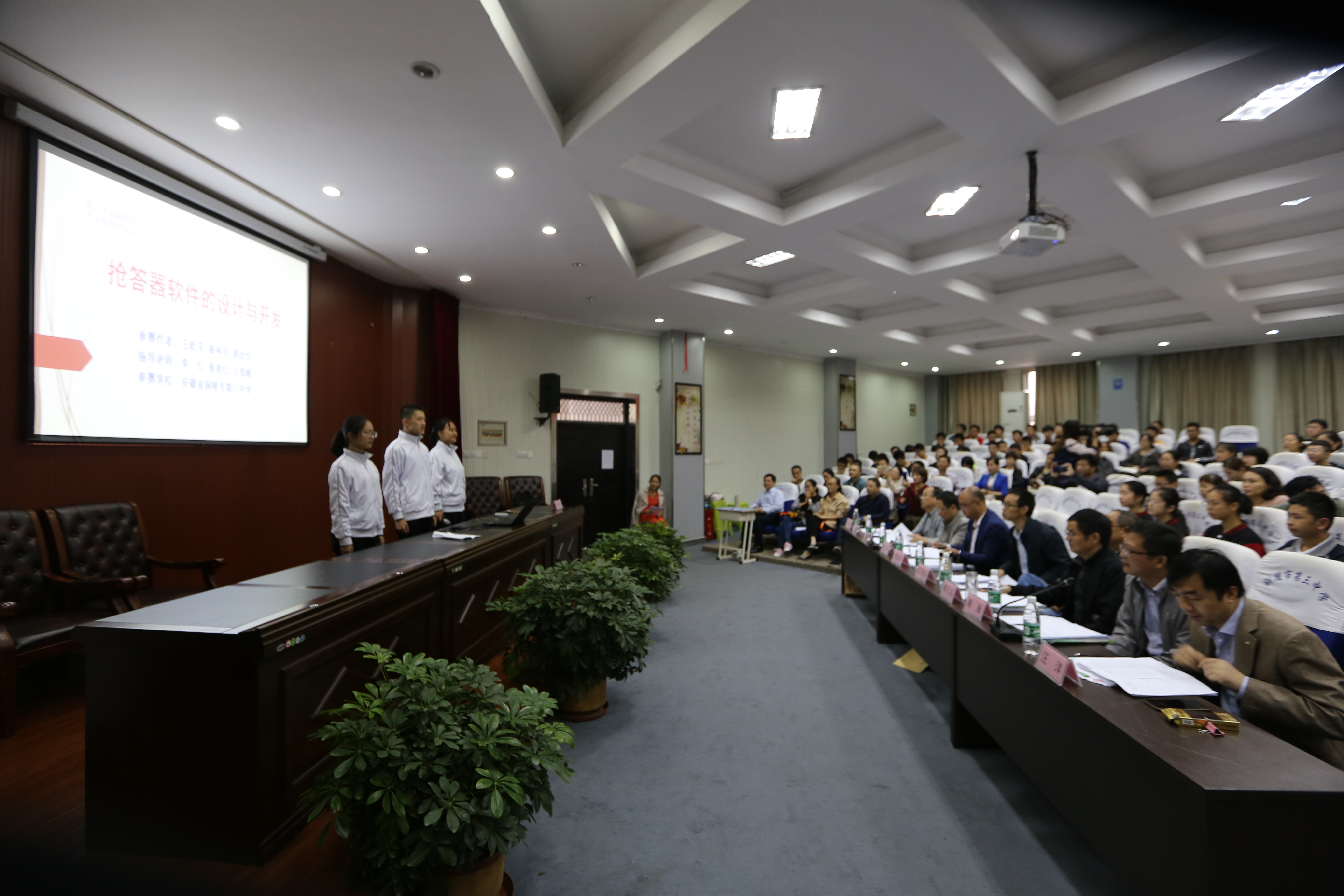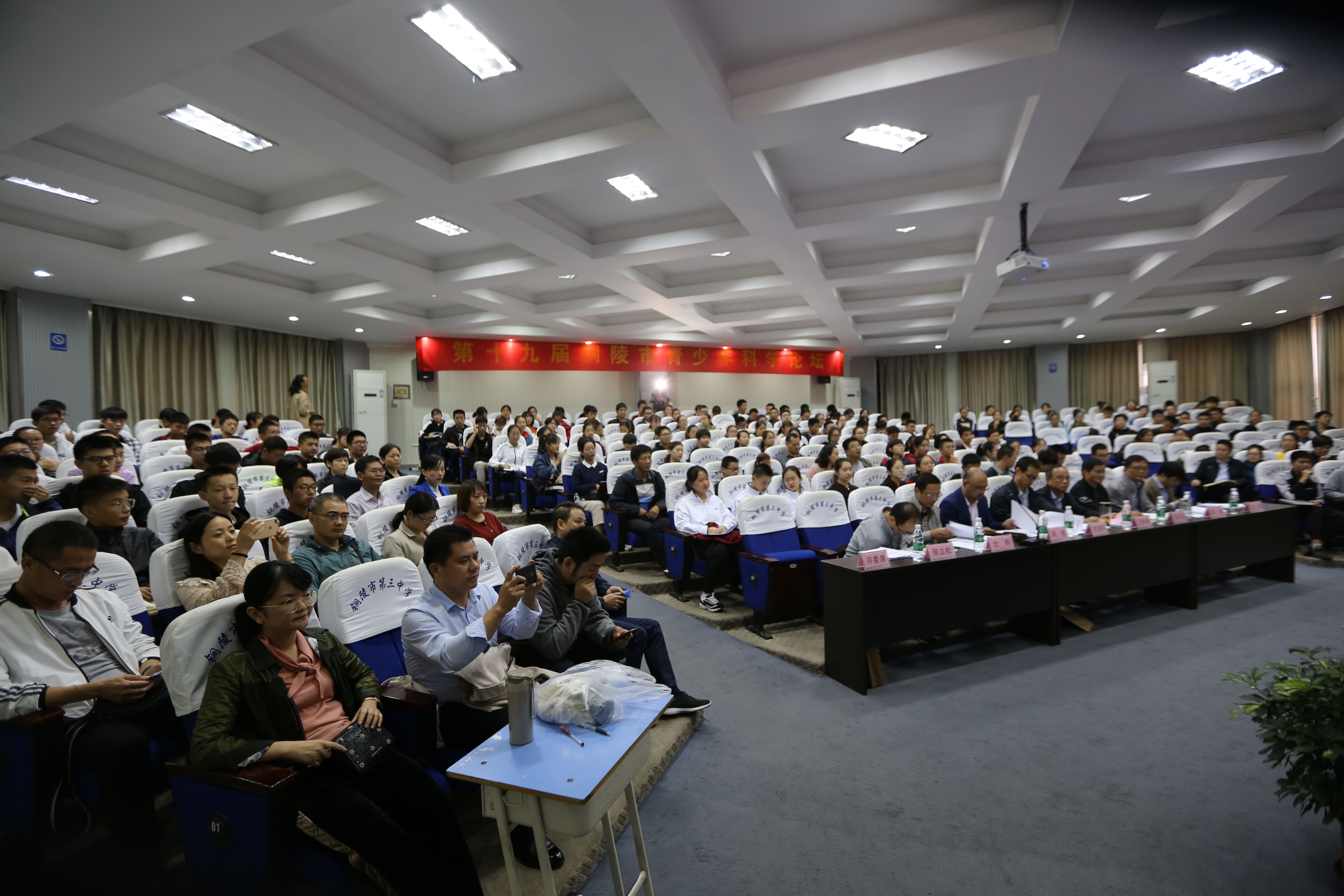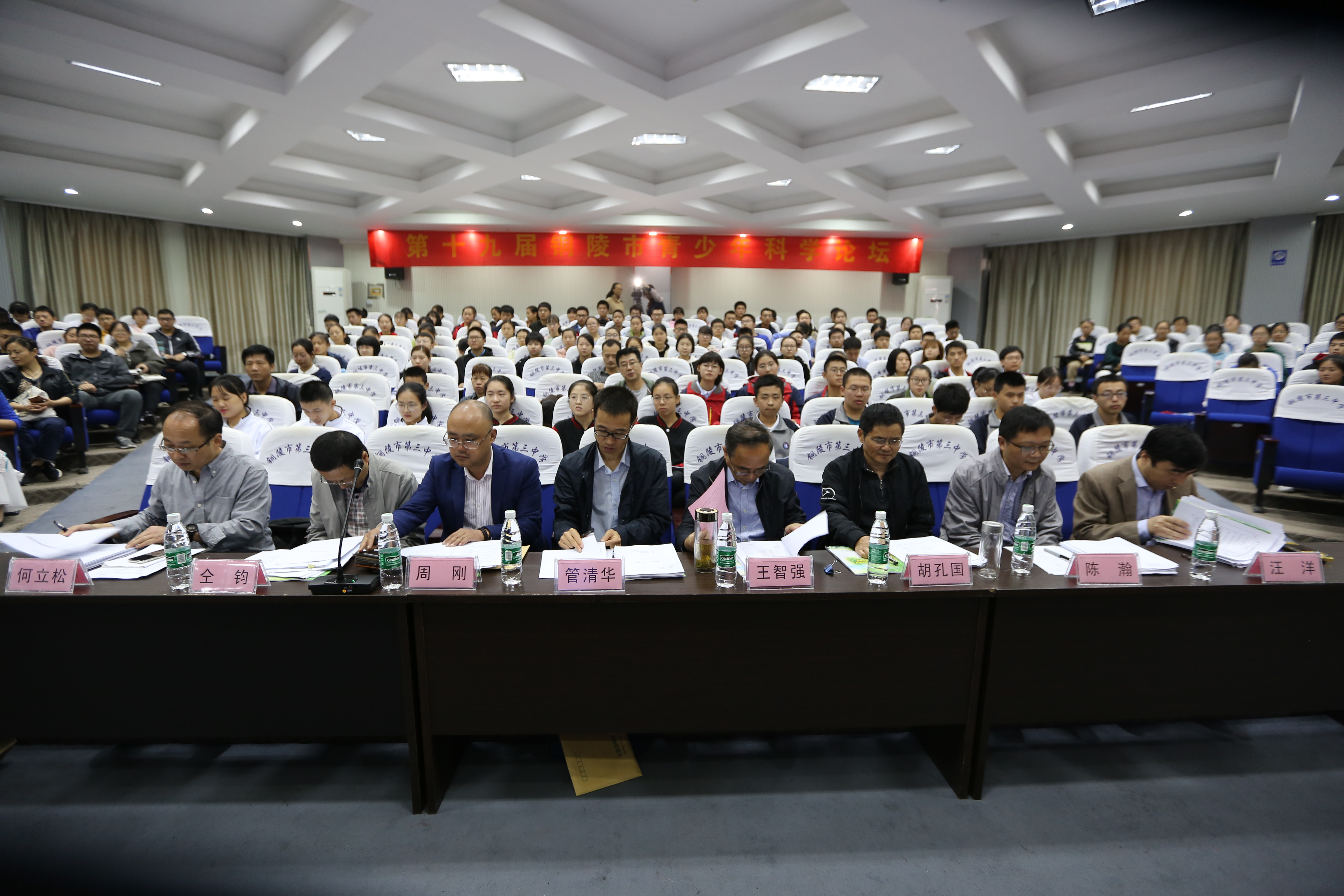 本校讯 10月13日上午,第十九届铜陵市青少年科学论坛在我校多功能厅举行,此次论坛由市科协、市教体局共同主办,铜陵三中承办。市科协副主席王智强,市教体局副局长管清华,安工学院实训中心主任、工程师周刚,市教体局教科所教研员胡孔国,市教体局教科所教研员何立松,义安区教体局信息中心主任陈瀚,市科协科普部部长汪洋、市科技馆馆长仝钧到场观摩、评判与指导。