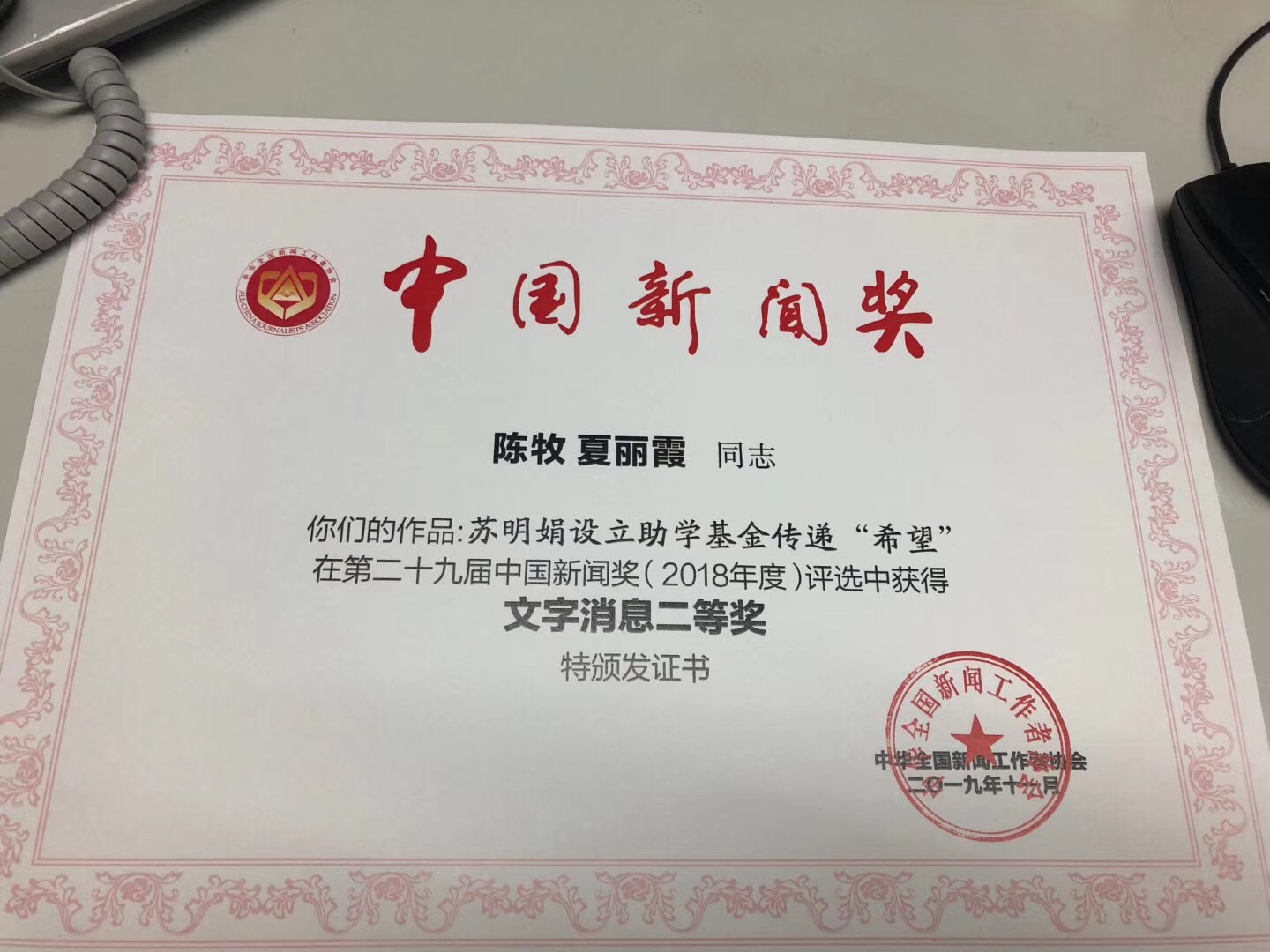 我校校友、新安晚报记者陈牧(06年毕业,班主任为张勇老师)和同事夏丽霞采写的文字消息《苏明娟设立助学基金传递“希望”》报道了对以希望工程形象代言人苏明娟本人名字命名的“苏明娟助学基金”收到首笔善款一事,不仅敏锐抓住了“大眼睛”苏明娟感恩社会、回报社会的闪光点,还揭示了“传递希望”的深层意义,获中国新闻奖二等奖,这是全国都市晚报类里面的最高奖之一,也是安徽省文字类新闻作品最高奖项。