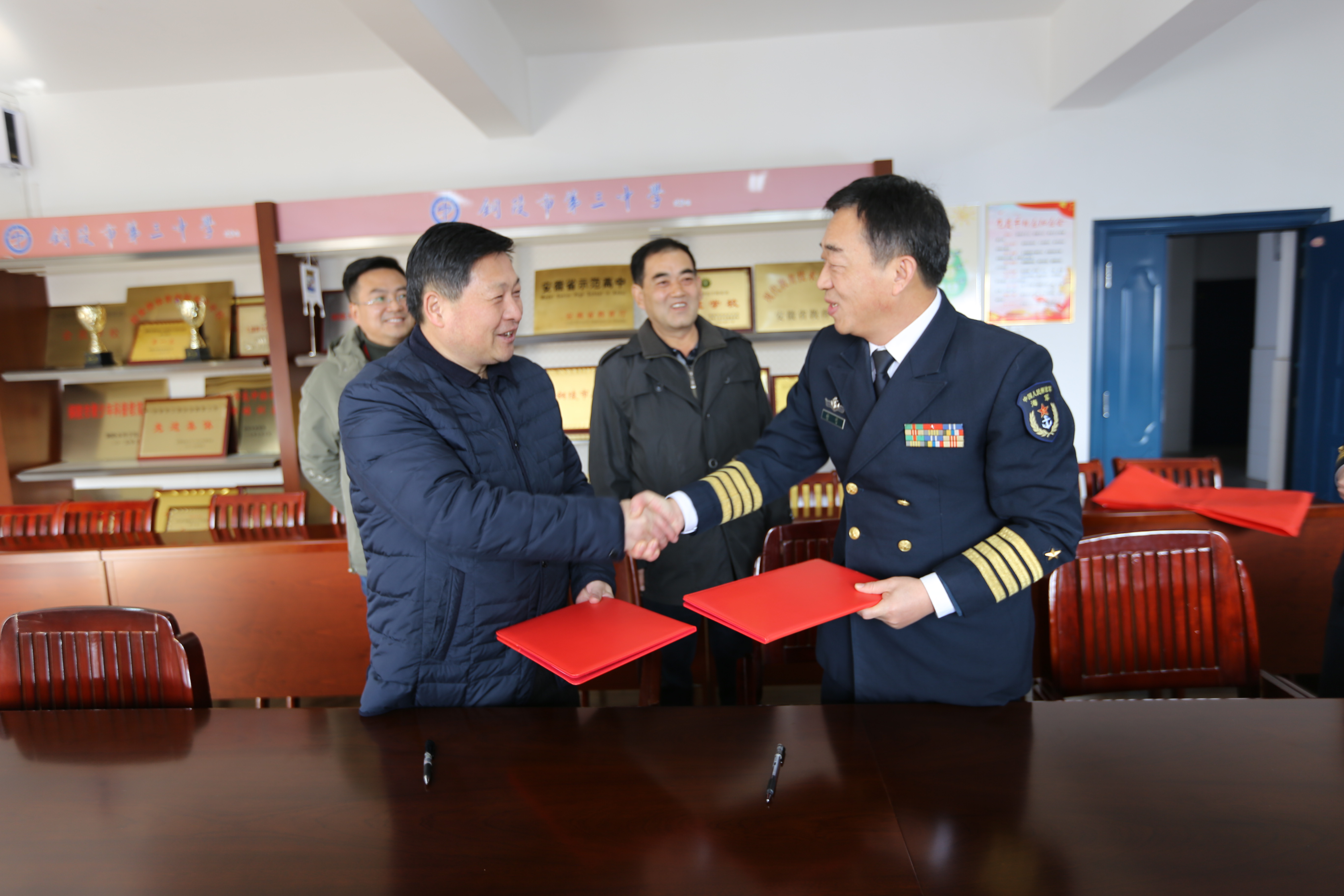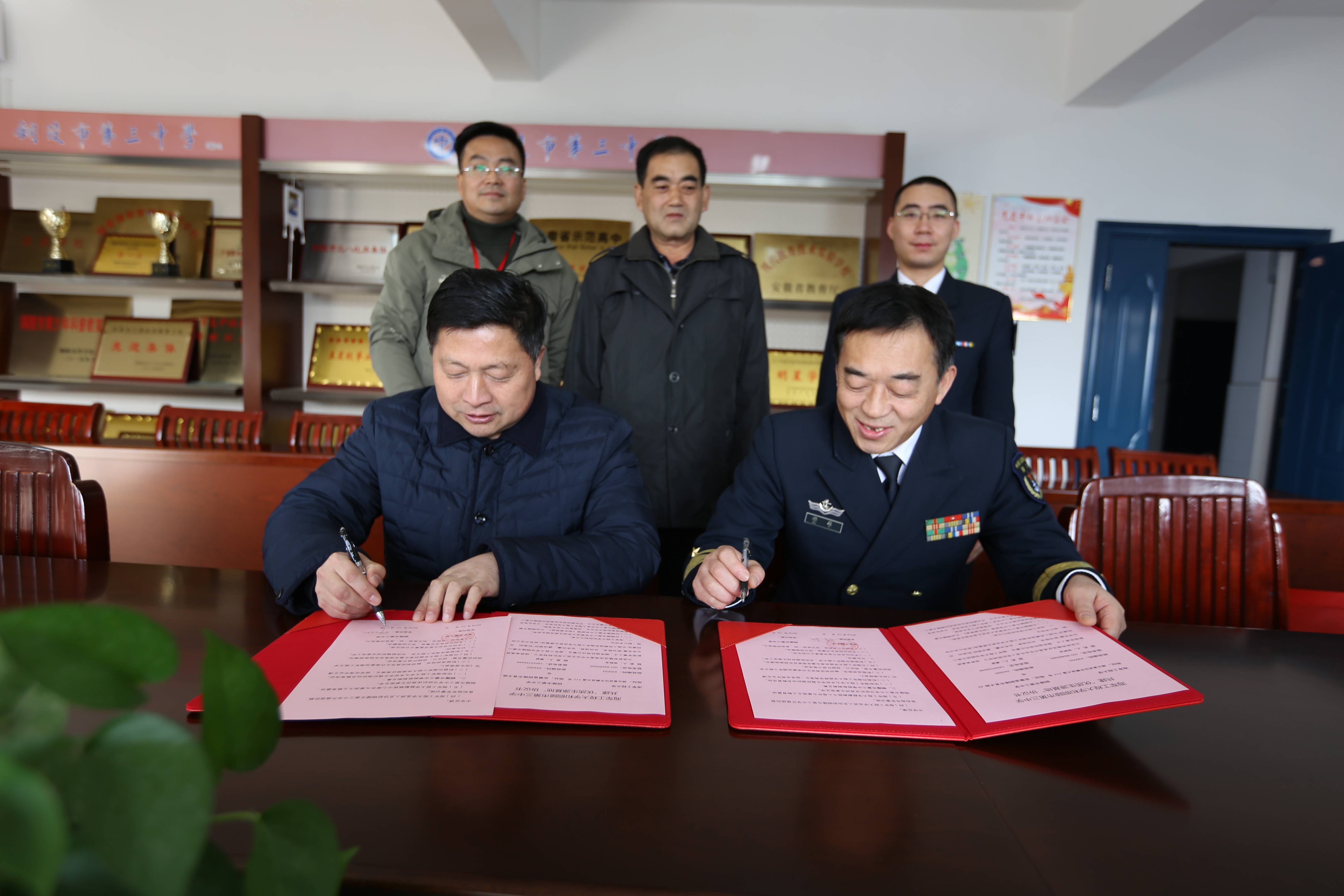 会谈后,钟士标校长和徐毅上校签订了合作协议,徐毅上校将“海军工程大学优秀生源基地”牌匾授予铜陵三中。