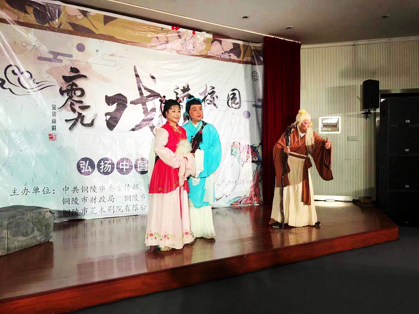 12月4日下午,铜陵市艺术剧院的数十名戏曲专家来到铜陵三中多功能厅,将戏曲文化送进校园。戏曲专家们精心准备,粉墨登场。精彩的表演引来阵阵掌声,广大师生沉浸其中,享受到了一场戏曲文化的盛宴。