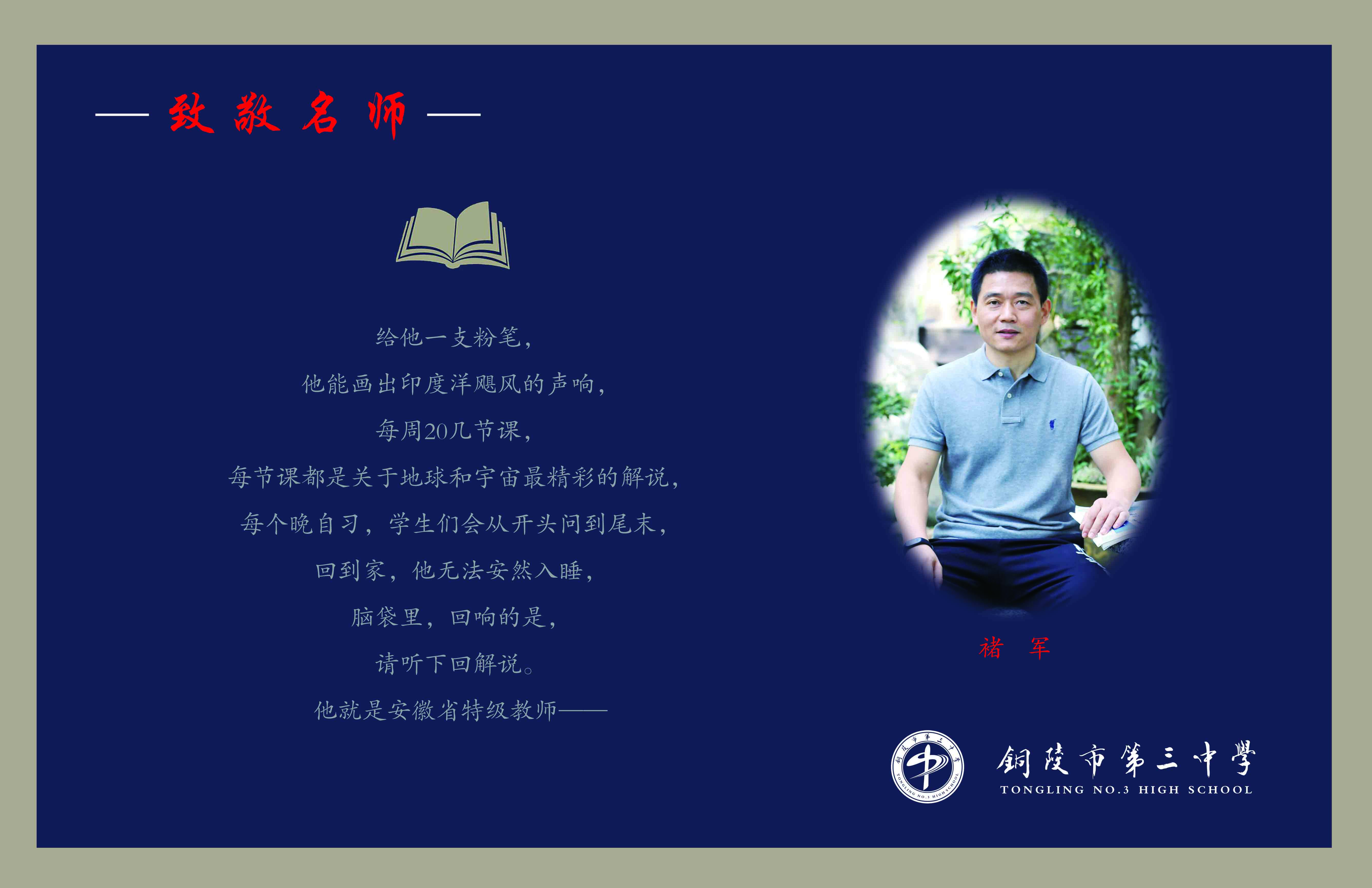 褚军,中学地理高级教师。全国首届高中地理优质课大赛特等奖获得者,省第三届教坛新星 ,省中小学远程教育首席辅导专家教师,市优秀教师,市学科带头人,市“名师讲学团”成员。 长期从事高中地理教学教研工作,担任过多届高三毕业班地理教学工作,教学经验丰富。课堂教学注重学生地理思维能力和人文素养的培养,形成自己独特的教学风格,深受学生喜爱,教学成绩显著。有多篇教研论文发表于《地理教育》、高考《考试报》等全国期刊,参与安徽省高中地理同步作业编写。多次荣获市教育局“优秀教师”、“优秀共产党员”、校“优秀教师”,“优秀党务工作者”等荣誉称号。多次受人教社邀请和省、市教研室委派去福建、东北、湖北、广州等地进行示范课展示和教师培训讲学,与同行切磋教艺,共同进步,教学深受同行好评。