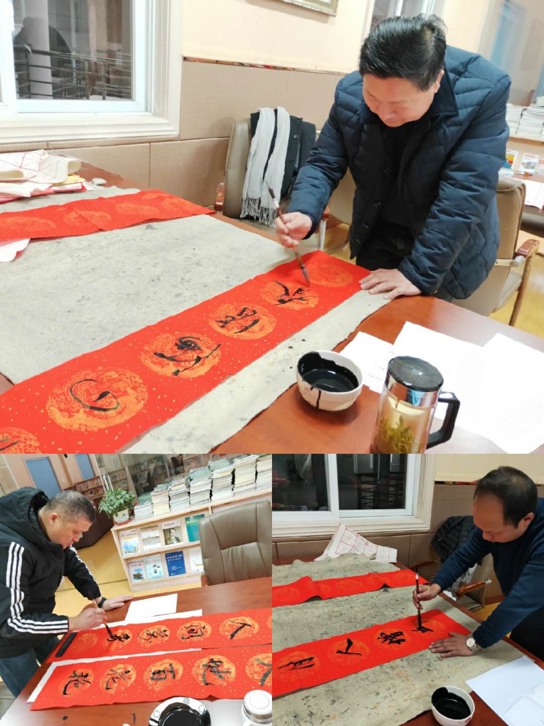 第一阶段,在校图书馆的教师阅览室,校工会邀请我校书法家任士民和王勇等老师,经过两天的辛苦书写,完成了春联书写的主要任务。