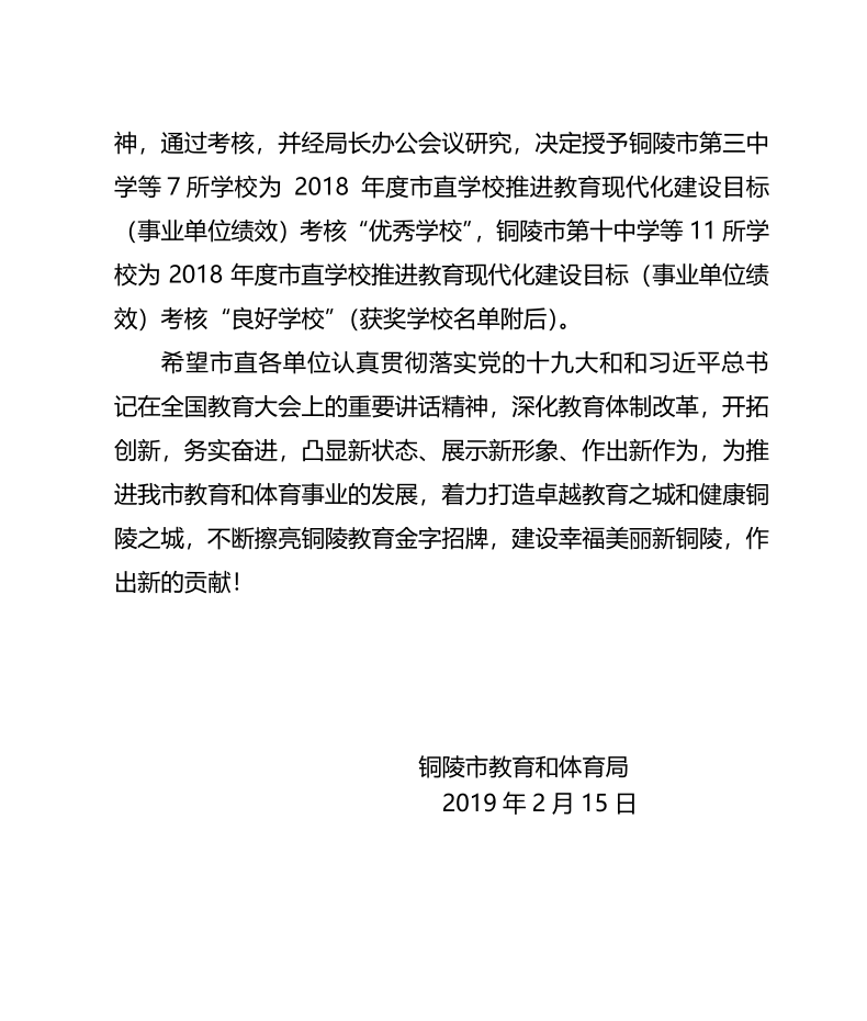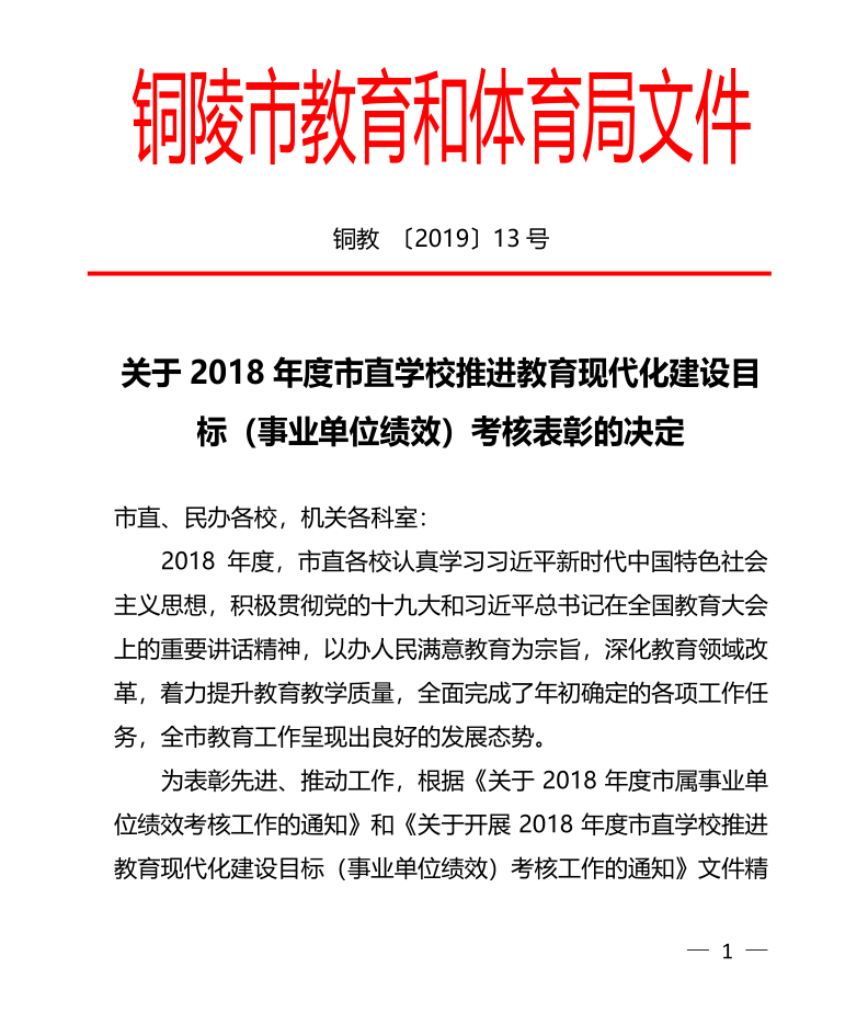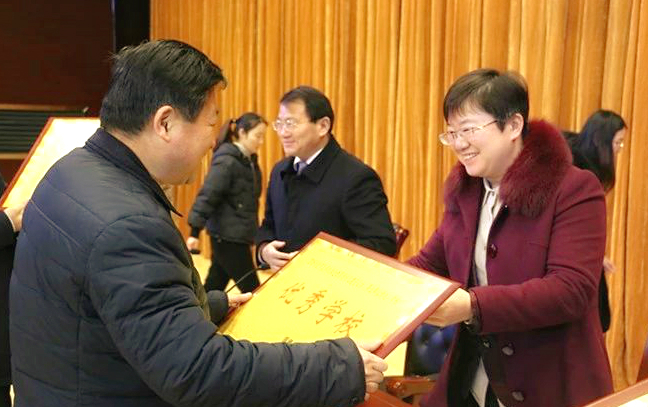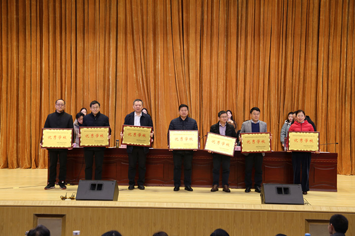 会议表彰了2018年度市直学校推进教育现代化建设目标(事业单位绩效)考核学校,七所学校被表彰为“优秀学校”,我校位列“优秀学校”考核名单第一名,市委常委、宣传部长、副市长昌红梅为我校校党委书记、校长钟士标同志颁发获奖铭牌。