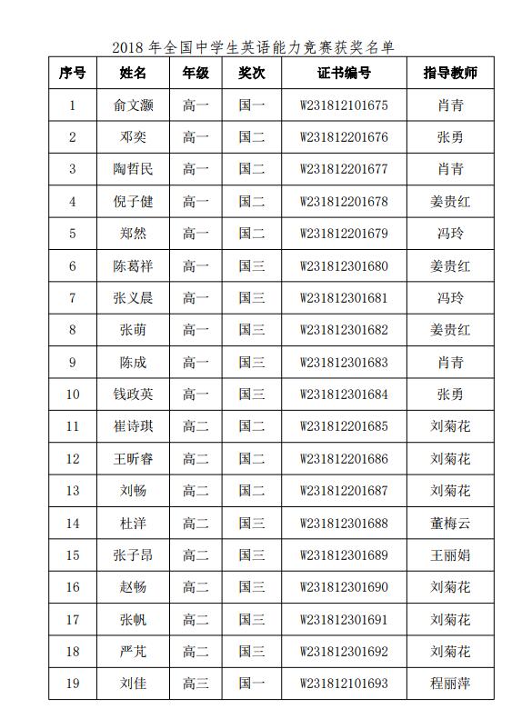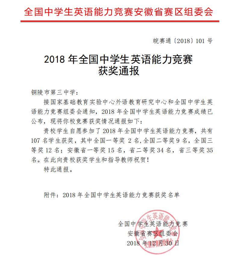 编按:英语学科是我校的强势学科之一,老师们教科研能力突出,多位老师有欧美留学与教学经验,经常当担省市外事工作会议现场翻译,出版翻译作品,自行出卷被全国同行引用。每年高考中,学生英语成绩在140分以上的不计其数,在各项国家省市英语大赛中,我校学生成绩总是光耀夺目,2018年的全国中学生英语能力竞赛成绩于日前揭晓,我校共有107位学生获奖,其中全国一等奖2名,全国二等奖9名,全国三等奖12名。辉煌的成绩,与三中英语组的科研水平、老师们的敬业指导、学生们的拼搏进取密不可分,经过多年努力,铜陵三中英语组已经建立起了完整成熟的金字塔形师资结构,形成了经验派、实力派、少壮派稳固强劲金三角团队。