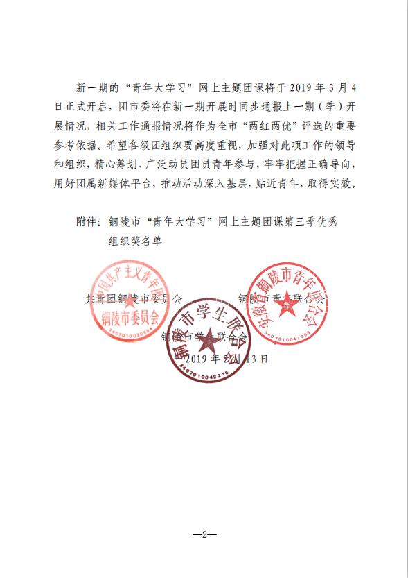 在校团委精心组织和各年级班主任的支持配合下,我校青年学子迅速掀起学习热潮,成效明显,受到团市委、市青联、市学联的充分肯定,并授予我校团委第三季“青年大学习”优秀组织奖!