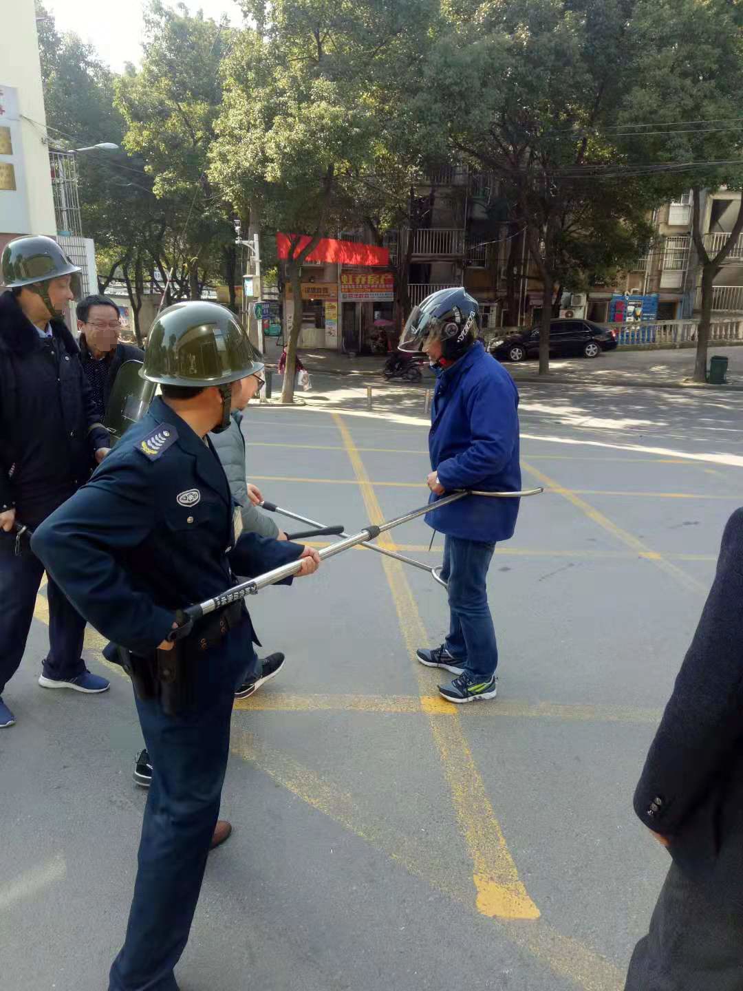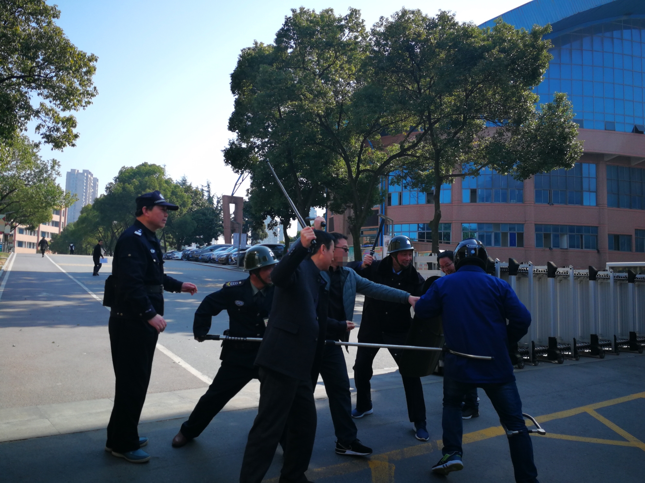 3月12日上午8:40,一名蒙面”歹徒”(我校反恐队员陈**扮演行凶歹徒),手持尖器冲击保安,准备强行闯入校园,学校值班人员看到此情况,立即向带班领导报告,按下一键式报警器报警,同时立即启动了《铜陵市第三中学反恐防暴应急预案》。在公安民警的带领下,学校反恐防暴队员手持防暴器械进行阻拦,经过近5分钟的搏斗,大家将“歹徒”成功制服,交由警察处理,学校宣布解除警报。
