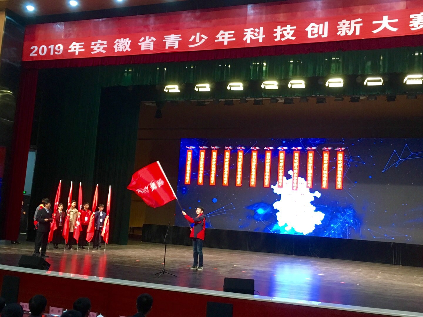 安徽省青少年科技创新大赛由省科协、省教育厅、省科技厅、省生态环境厅、省体育局、省团委、省妇联和淮北市人民政府共同主办,是我省规模最大、层次最高、最具品牌效应的青少年科技教育活动,是科技后备人才培养的坚实支撑。大赛涵盖数学、计算机科学、物理学、微生物学、环境科学、行为与社会科学等13个学科。本届大赛共收到各市级组织单位推荐的各类参赛作品853项,来自全省18个代表队、600多位青少年选手参加此次决赛。在荣获铜陵市青少年科技创新大赛一等奖基础上,我校共有3个作品、9位选手参加了安徽省青少年科技创新大赛决赛,高二(19)2班的张子昂同学凭借出色的表现,被选任铜陵市参赛代表队的旗手。