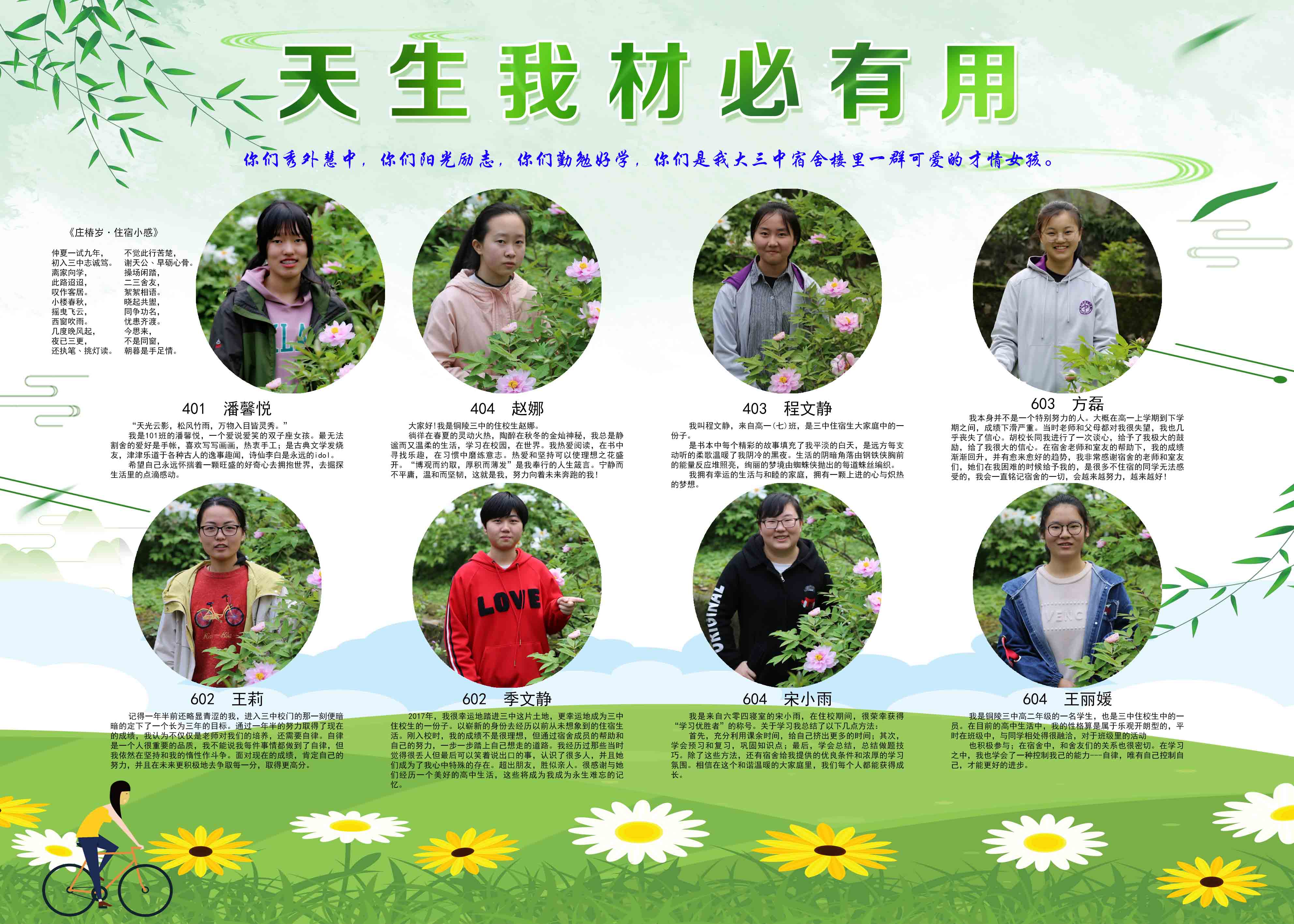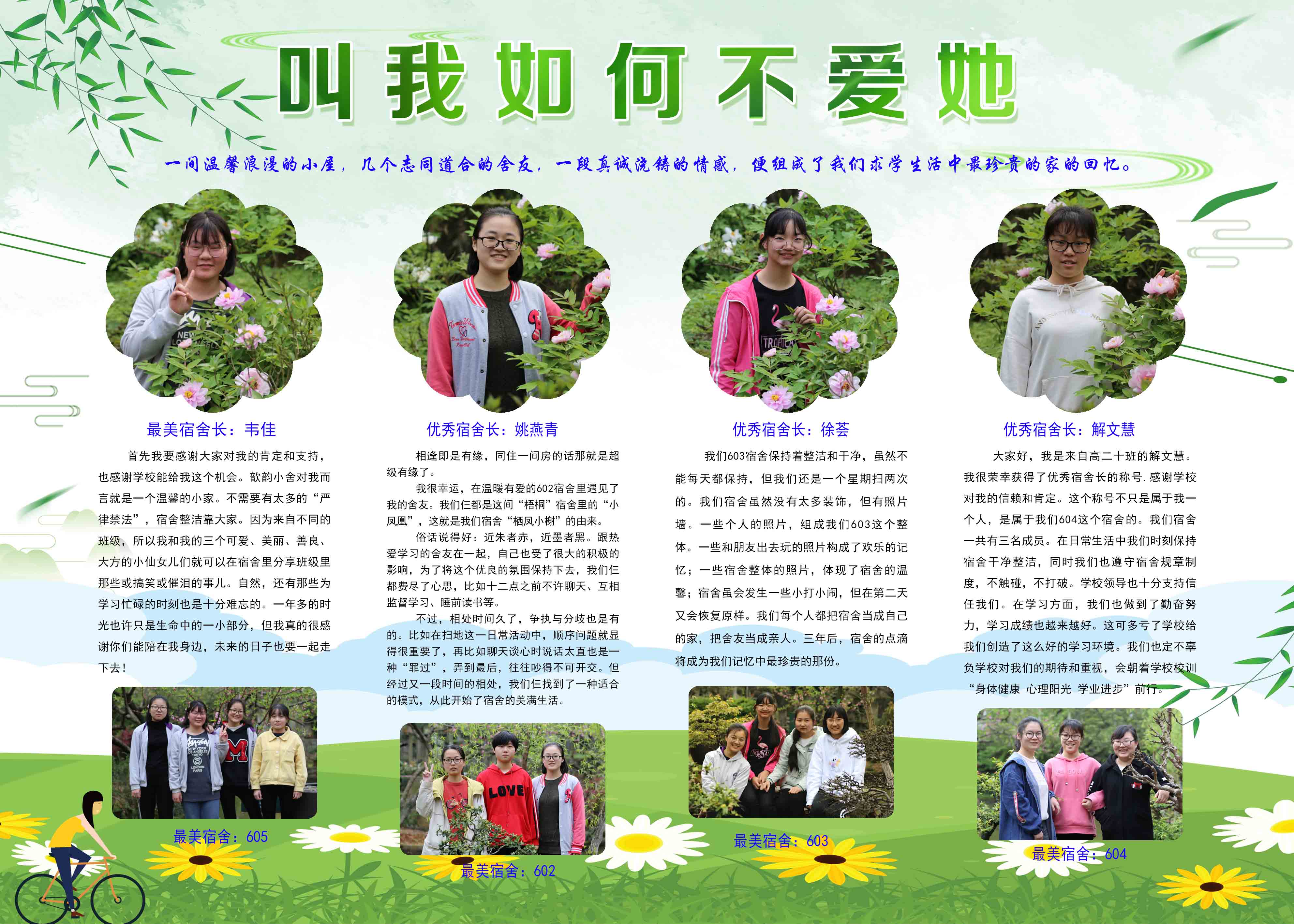 今年的展示活动按照三个板块进行,一是以“春天”为主题,开展宿舍文化墙、舍名、舍牌设计制作比赛;二是根据上学期宿舍文化评比的结果,开展“最美宿舍”、“最美宿舍长”及“优秀宿舍长”形象展示活动;三是对住校生中连续两次在班级月考中进入前十的学习优胜者,开展“我学习,我进步”展示活动。