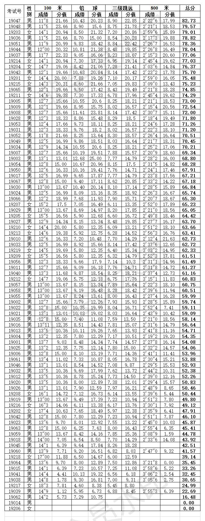 我校2019年体育特长生(田径)招生考试在市教体局领导的关心指导下,已于2019年5月11日顺利完成,现将成绩公示如下。如有异议,请于2019年5月18日前与铜陵市第三中学教务处联系。