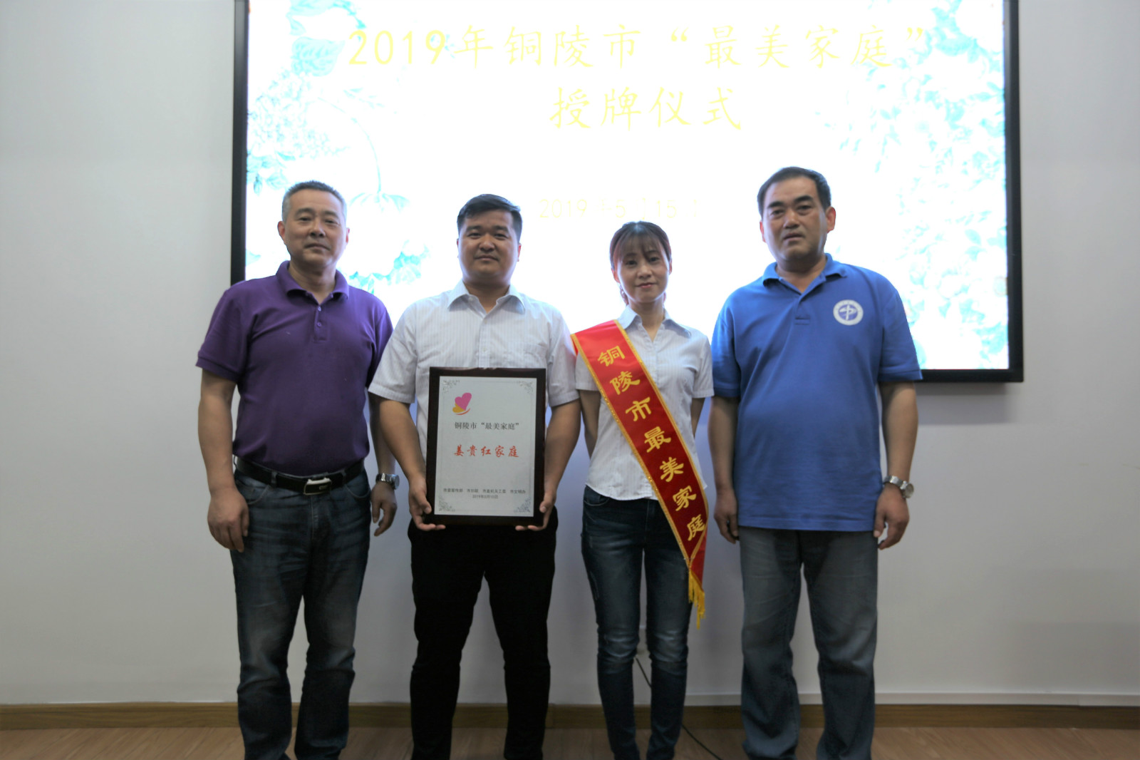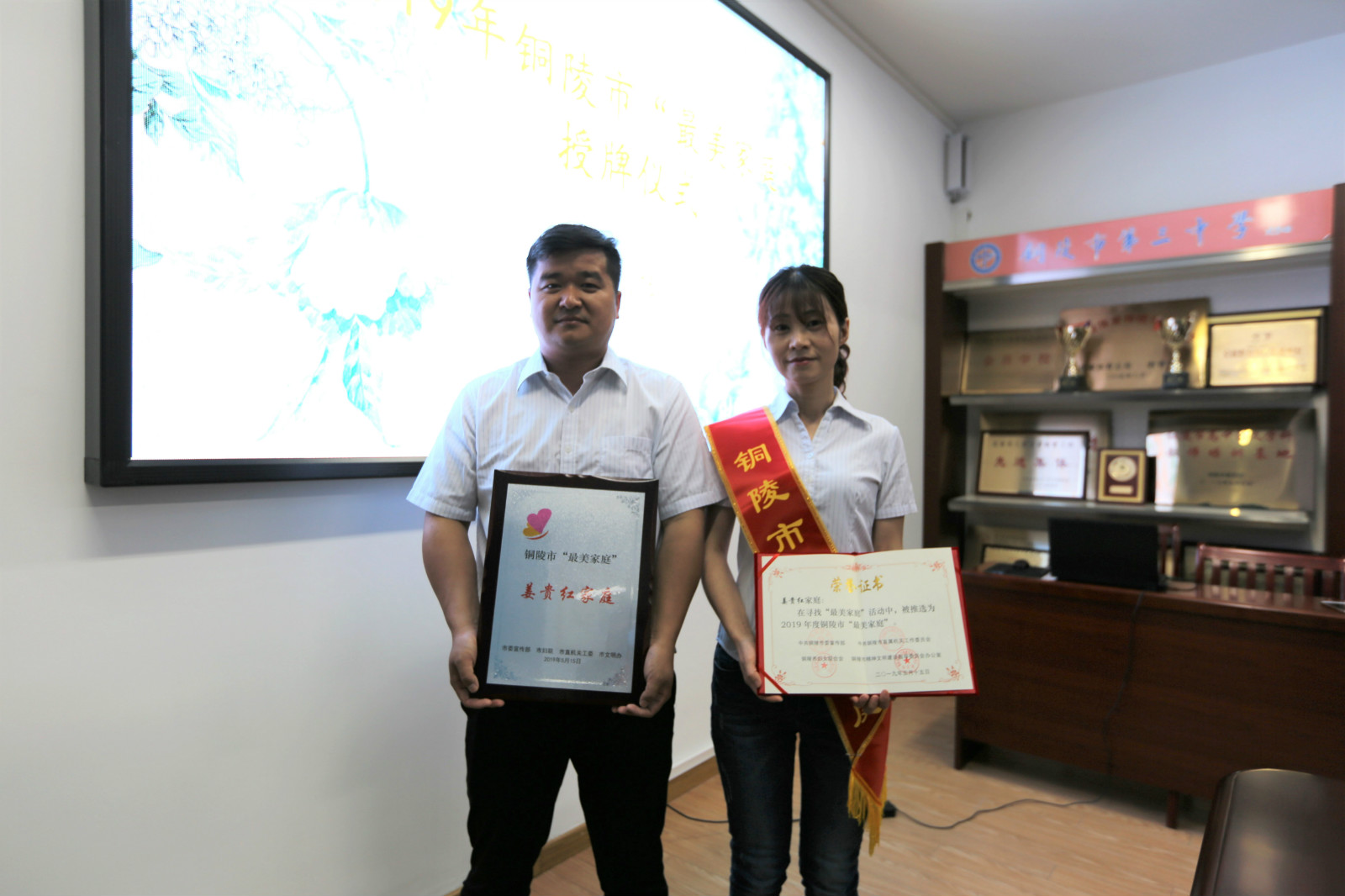 本校讯 为深入贯彻习近平总书记关于注重家庭、注重家教、注重家风的重要指示精神,大力培树宣传新时代家庭文明建设先进典型,弘扬社会主义家庭文明新风尚,进一步创新深化家庭文明建设工作,5月15日,市妇联副主席刘天英、市教育和体育局行政许可服务科科长徐琼华来到铜陵三中,为获得2019年铜陵市“最美家庭”的姜贵红、李红夫妇举行授牌仪式,副校长张国荣和工会副主席陈晰出席授牌仪式。